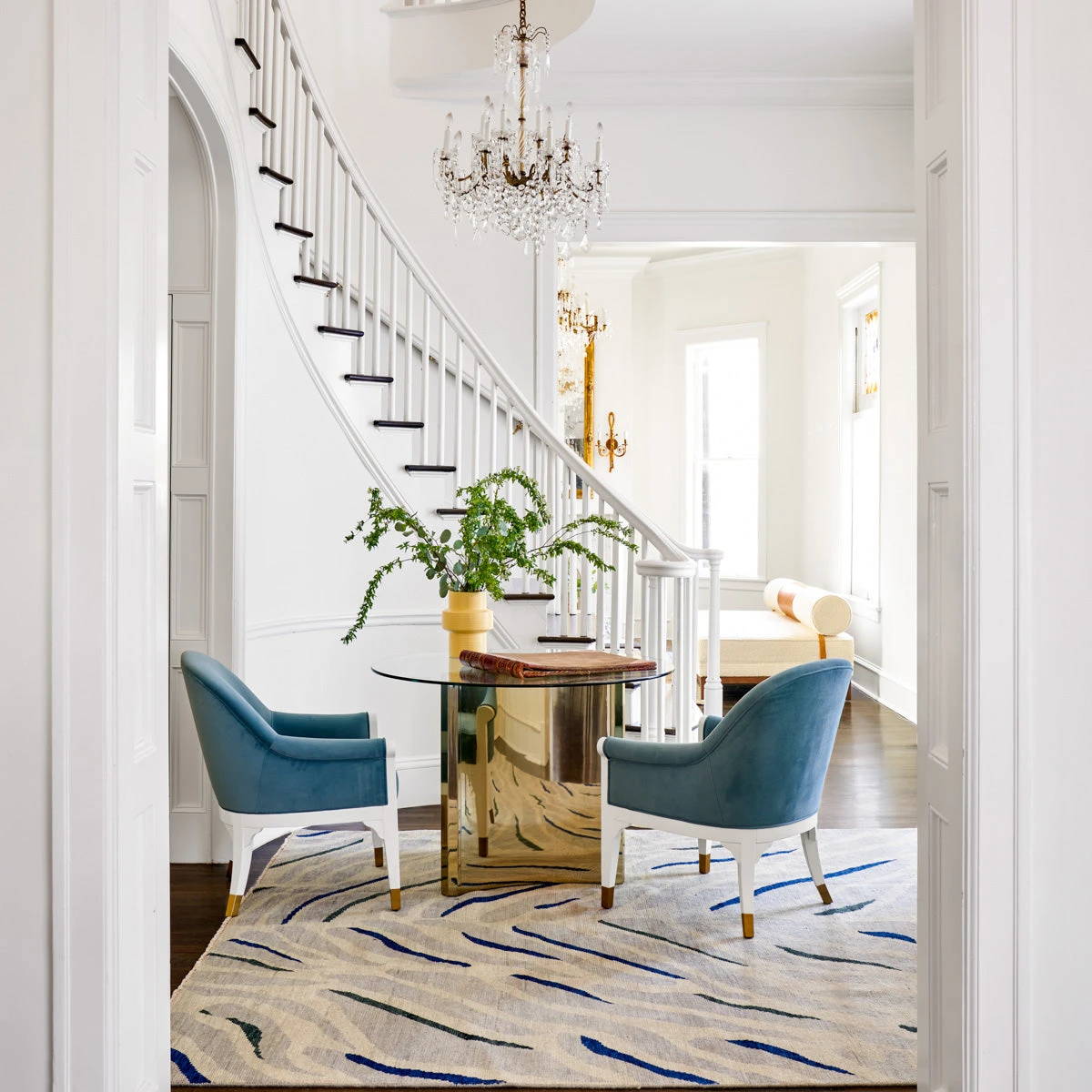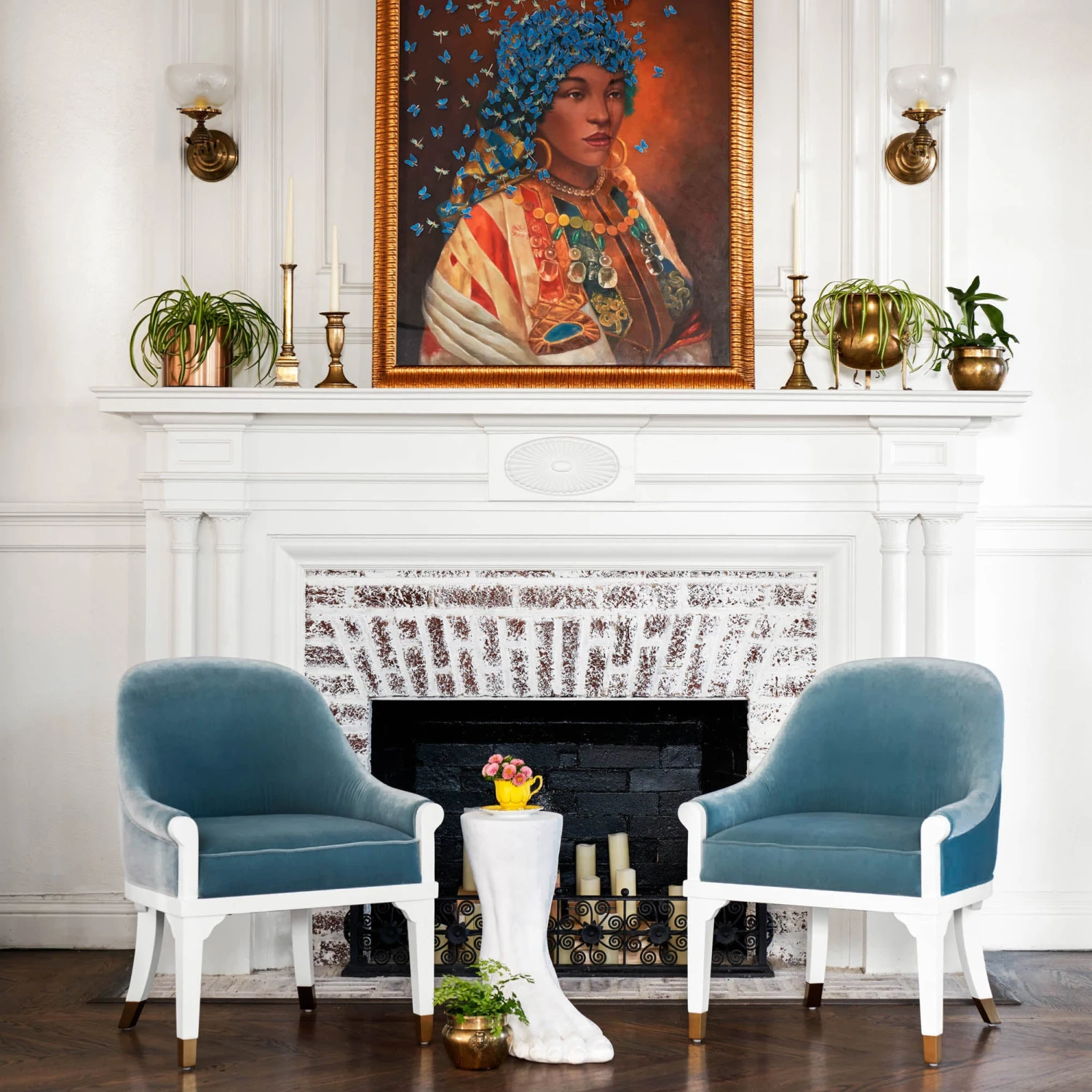 Our Adele Chair is a versatile occasional chair with just a touch of sass. Blue velvet upholstery meets a modern white lacquer frame with curved arms and brass sabot details.