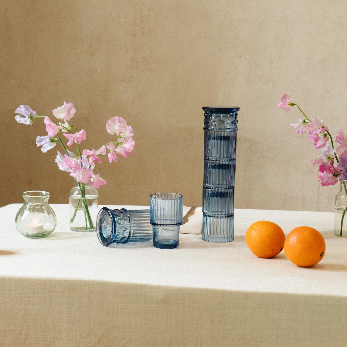 Sure to delight, these blue glasses stack to form a column inspired by classic Roman architecture.