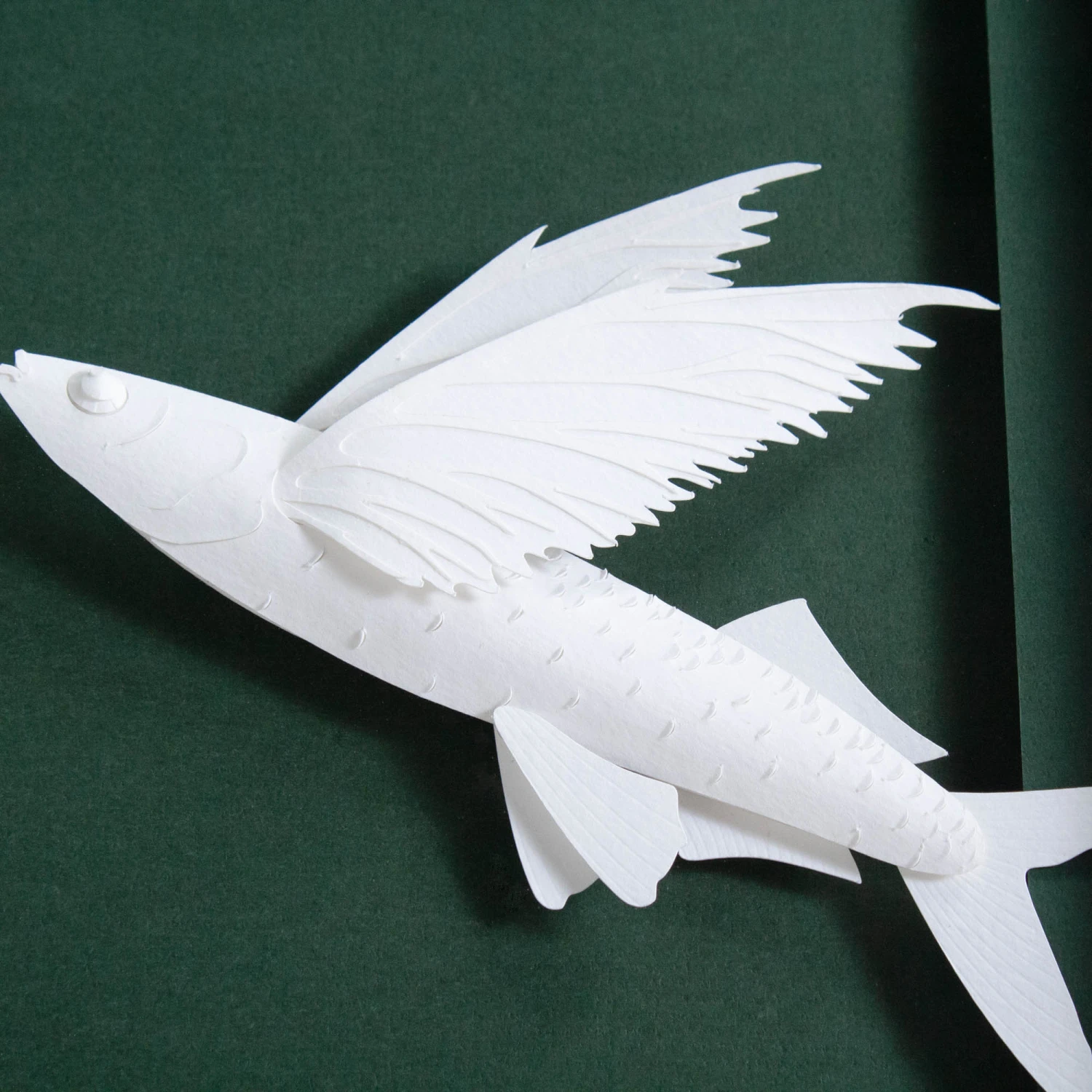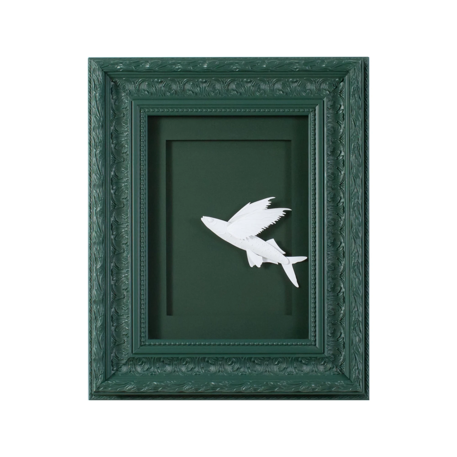 Hand crafted from paper, this fish is magnificent against a dramatic dark green backdrop. The fish is fixed to green matte paper with float mounting, enclosed behind plexiglass with an elaborate painted green frame.