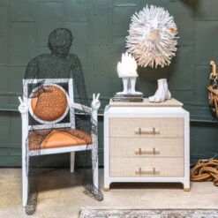 This Brutalist style chandelier features floral motifs made of hammered metal and decorative wrapped wiring. We love the whimsical feel and visual intrigue that this piece brings to the ceiling.