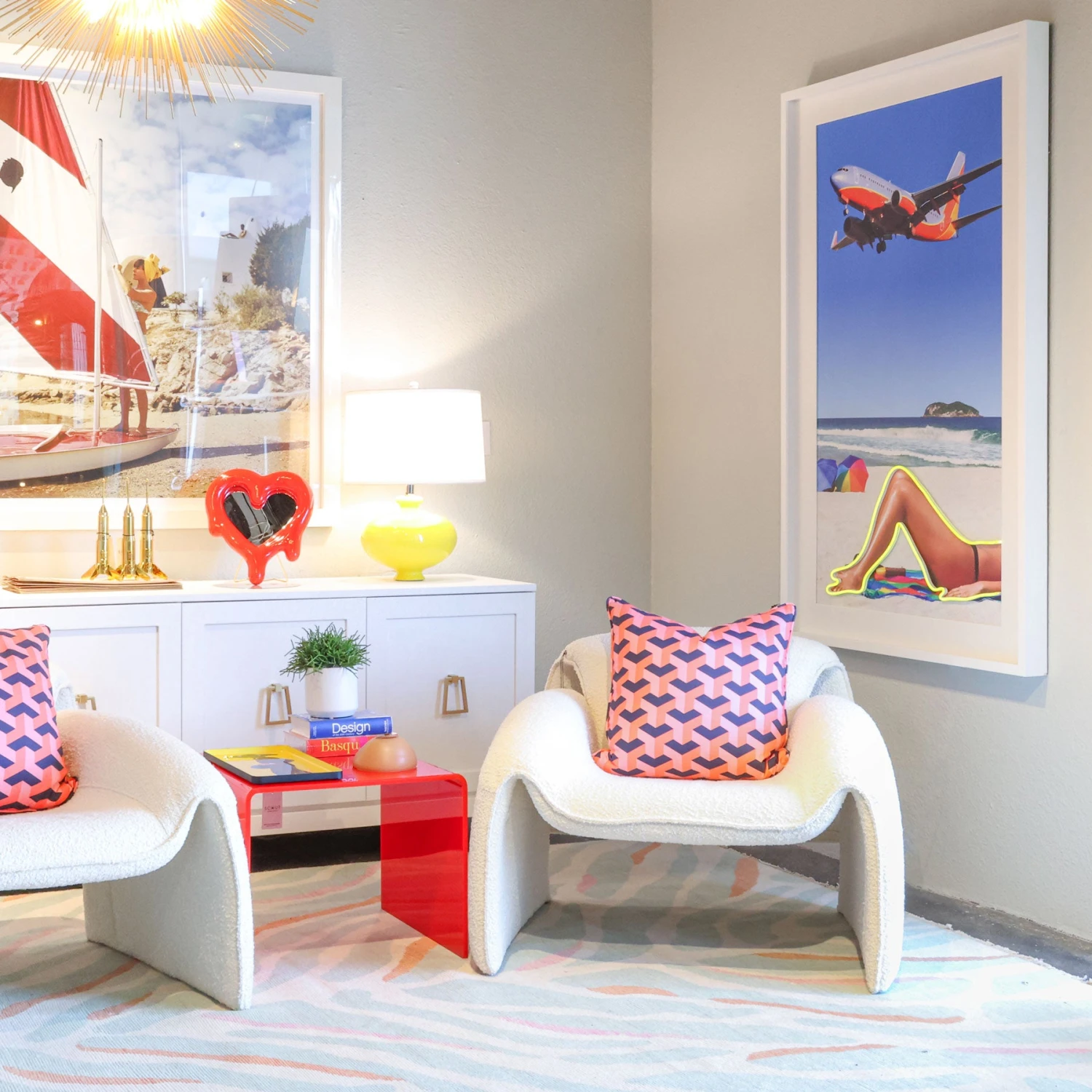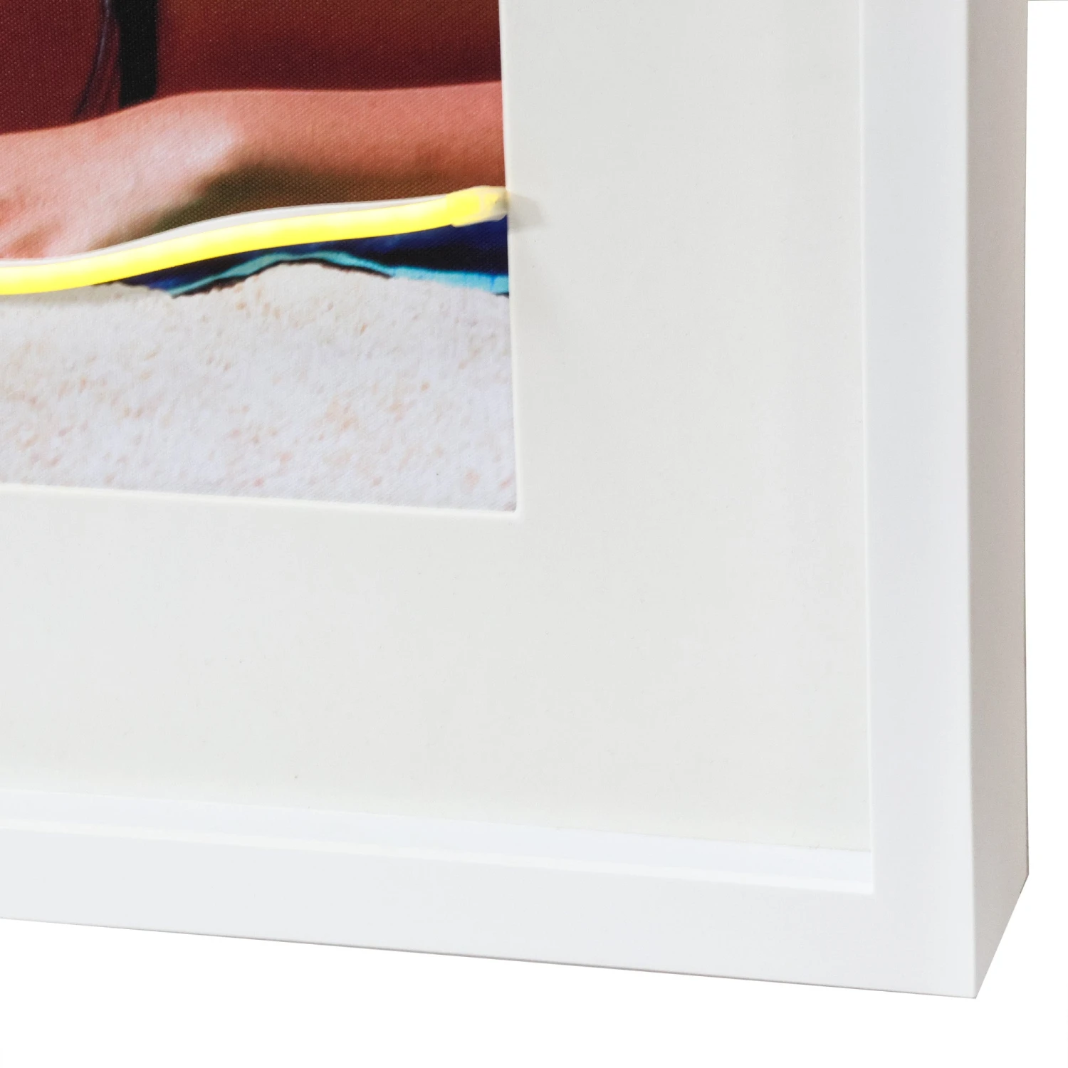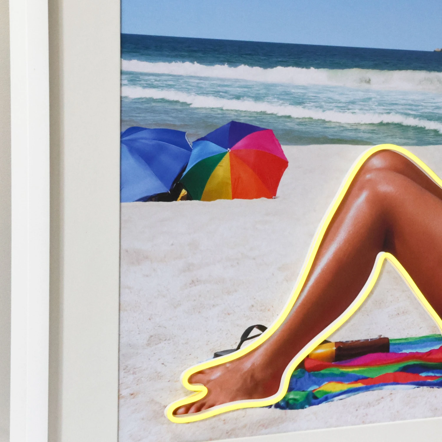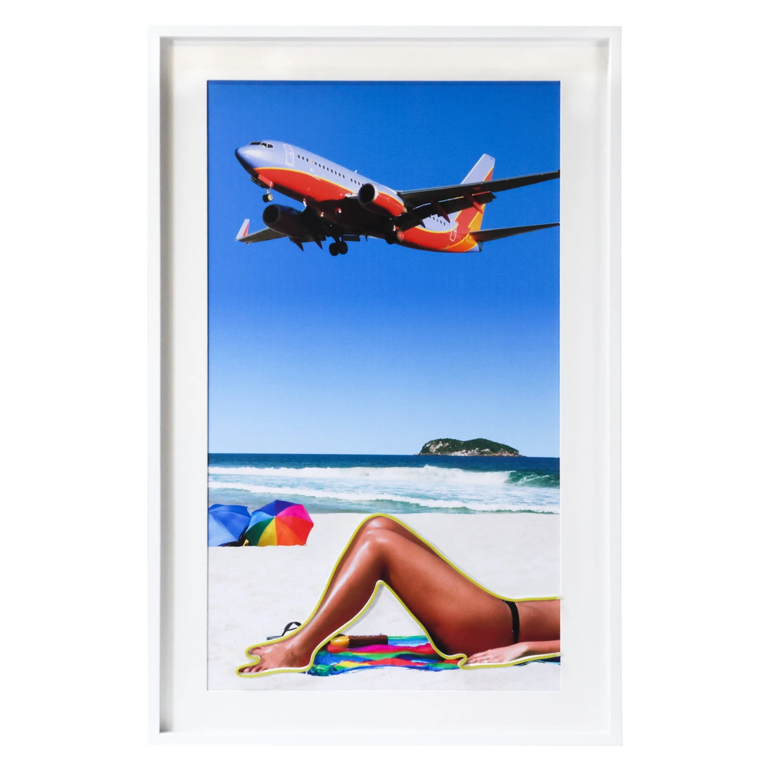 Colorful beach photography print featuring a plane in the sky and a woman tanning. Neon lights around the woman make this piece POP. Framed in white.