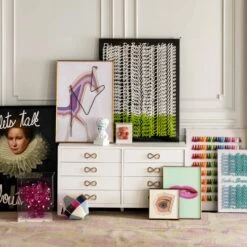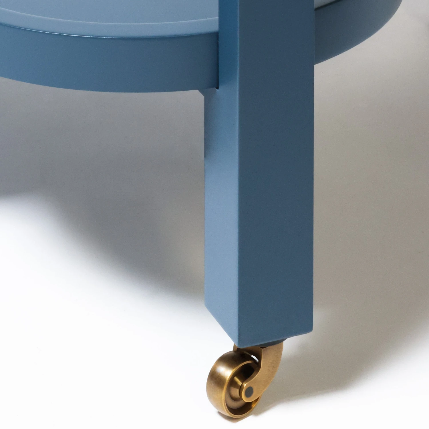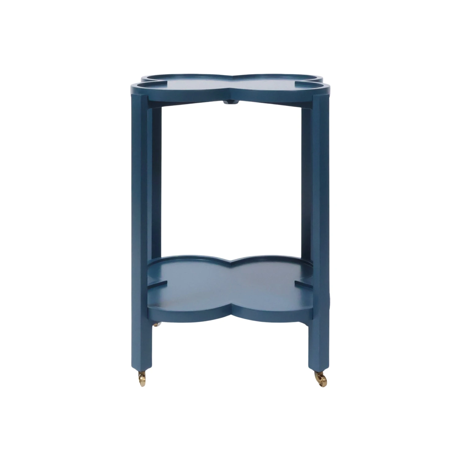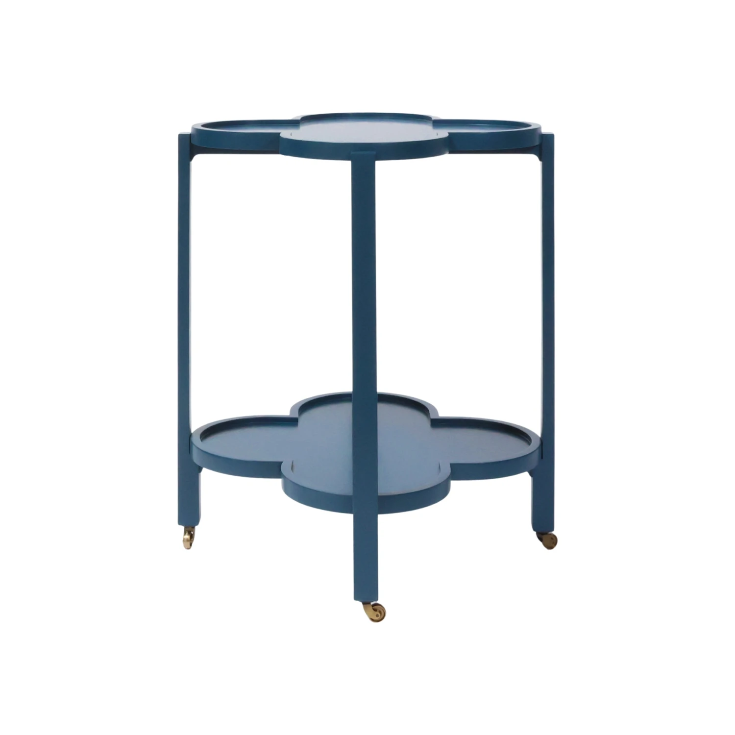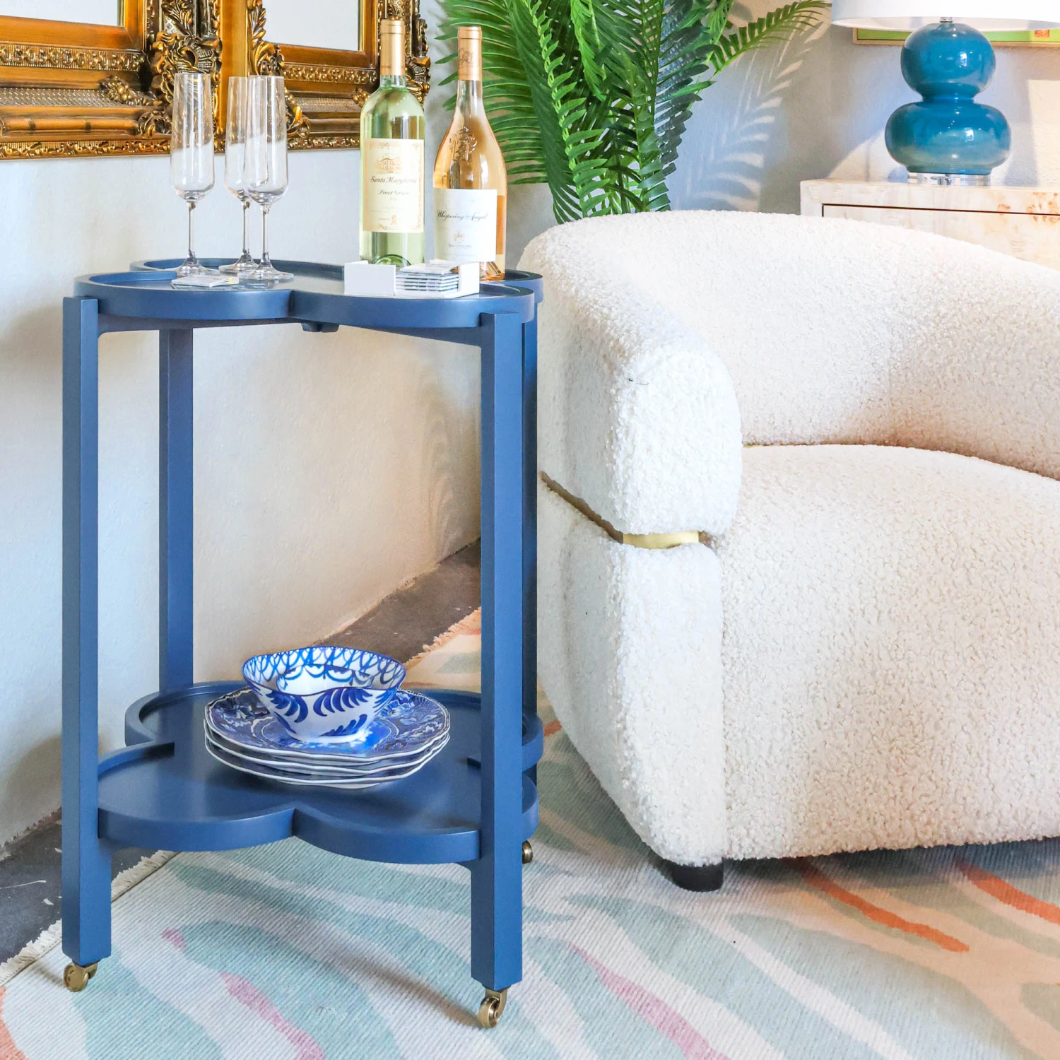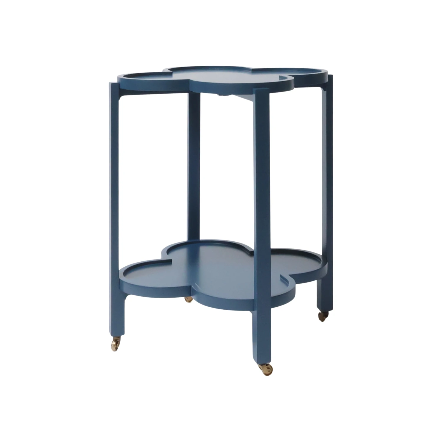 Our Clover Bar Cart features gentle curves that form the shape of a lucky four leaf clover. A double tier provides extra room to show off your favorite bottles and glasses, while a matte dark blue lacquer finish adds a touch of drama. Brass castors make moving this chic piece a breeze, so you can have cocktail hour anywhere.