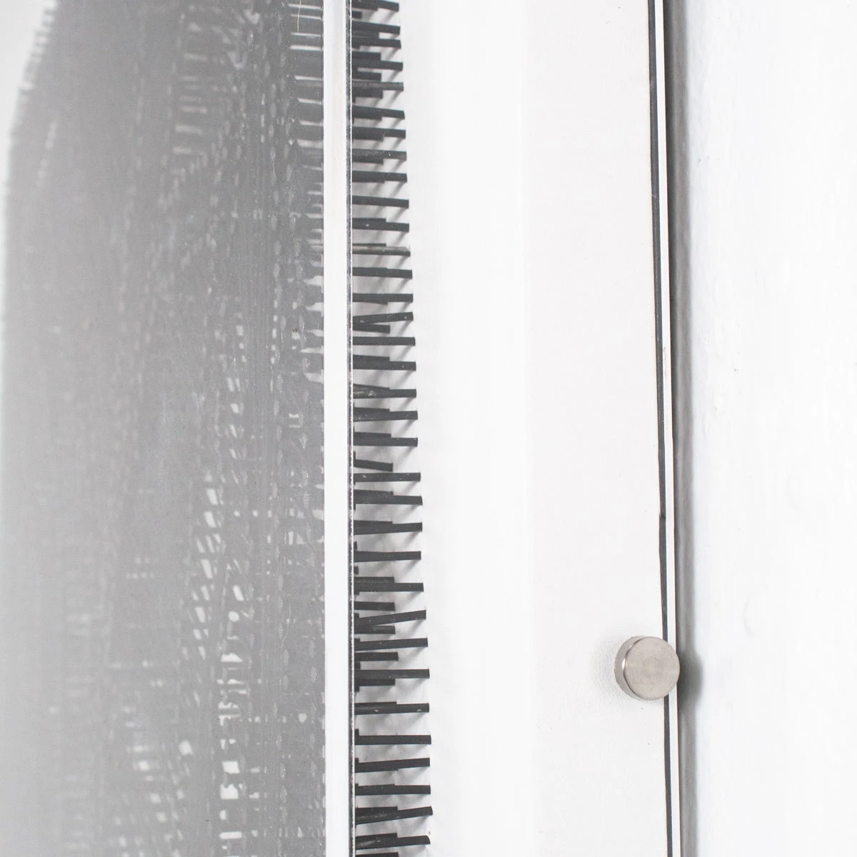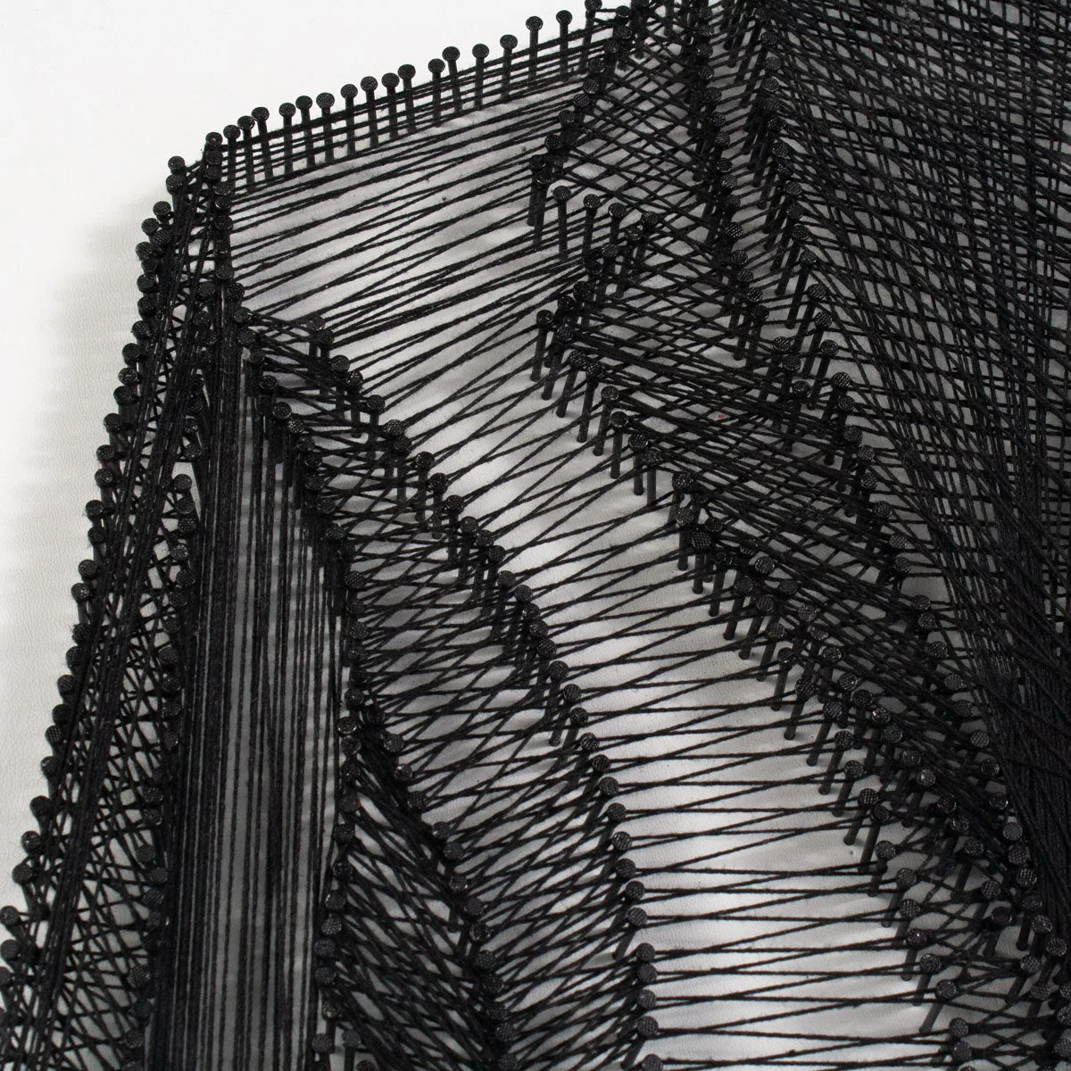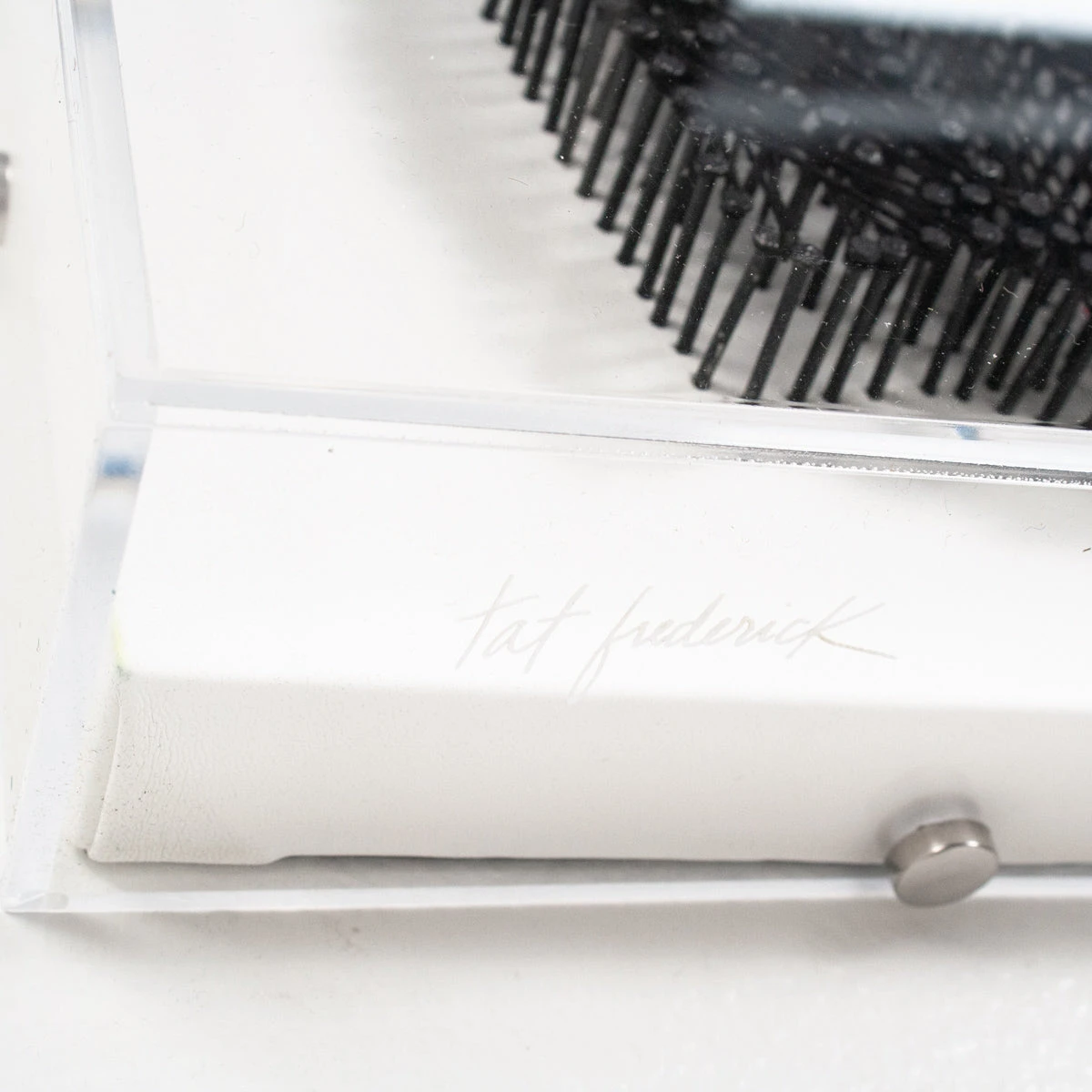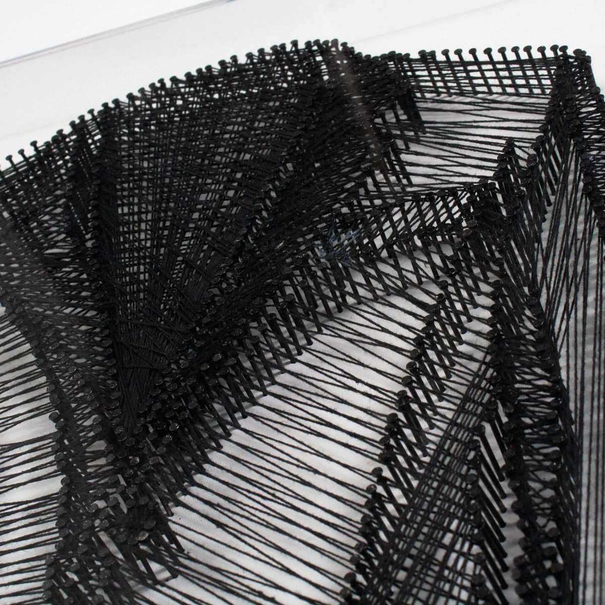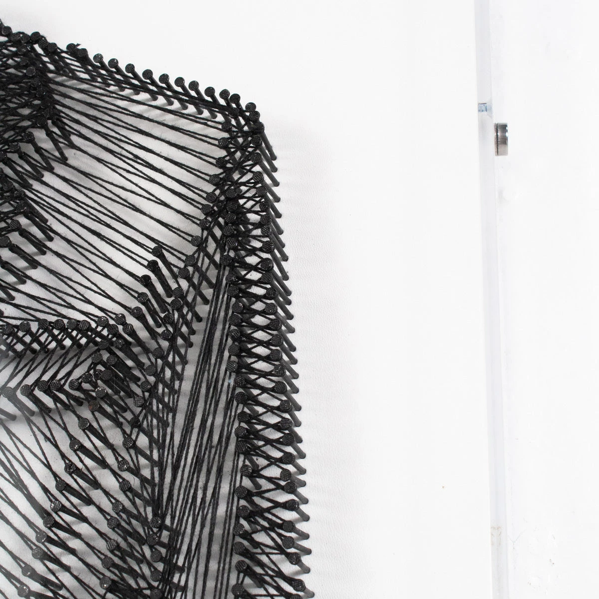 Mix and match with with the rest of the Damsel & Dapper Series for a fun-filled wall. Hand-placed nails are hammered into canvas and black string forms a jacket. Framed in an acrylic shadowbox.
