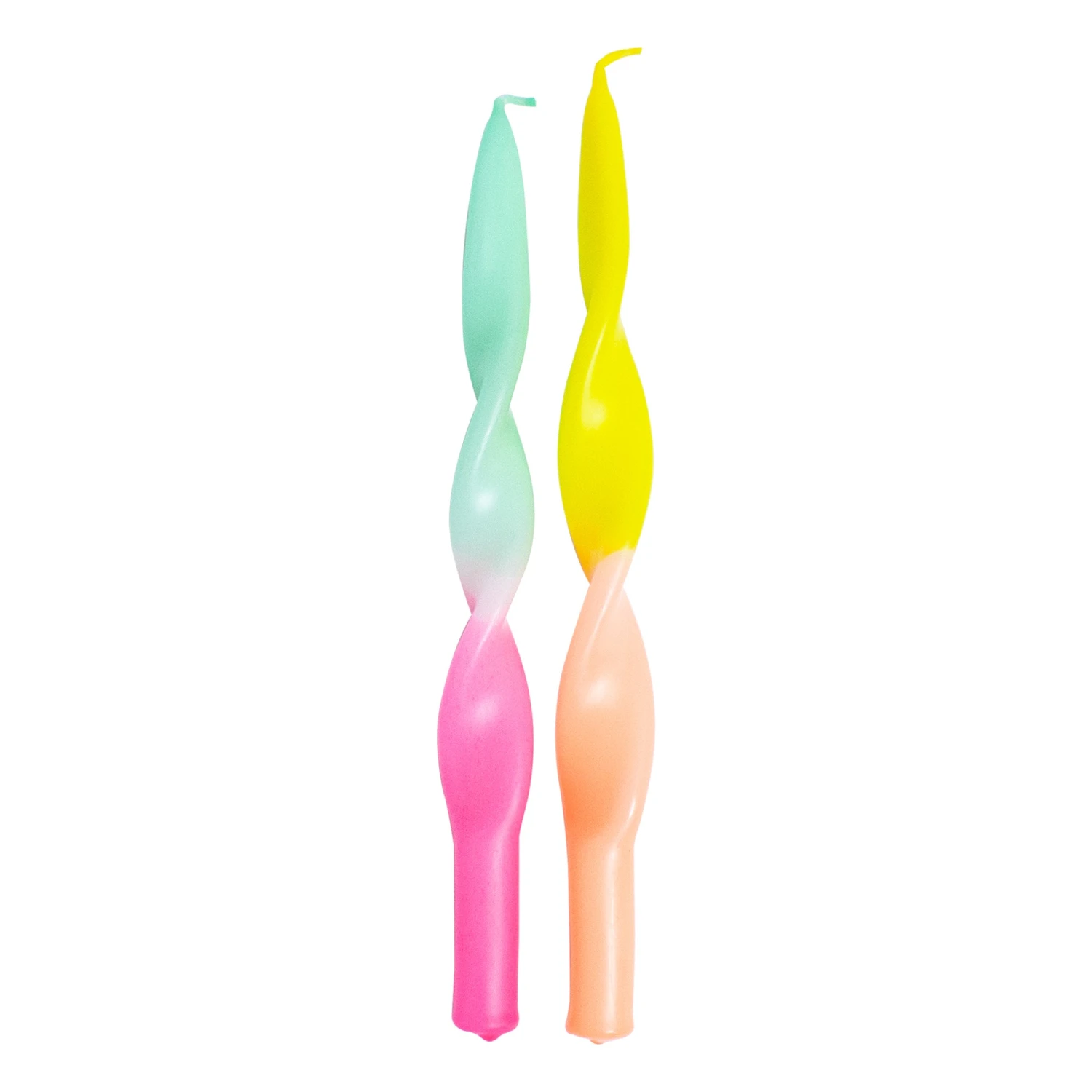 Set of two lovingly hand-colored, twisted taper candles in a neon look. While the colors stay the same, the pattern gradients vary with each candle to make it one-of-a-kind.