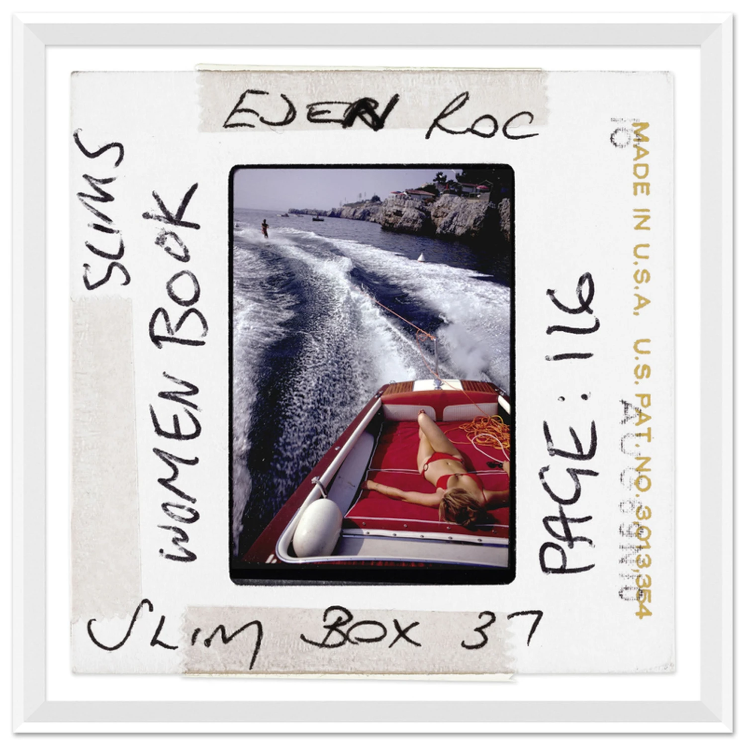 Photography by Slim Aarons of a woman sunbathing in a motorboat as it tows a waterskier, in the sea off the hotel du Cap-Eden-Roc in Antibes on the French Riviera, August 1969.