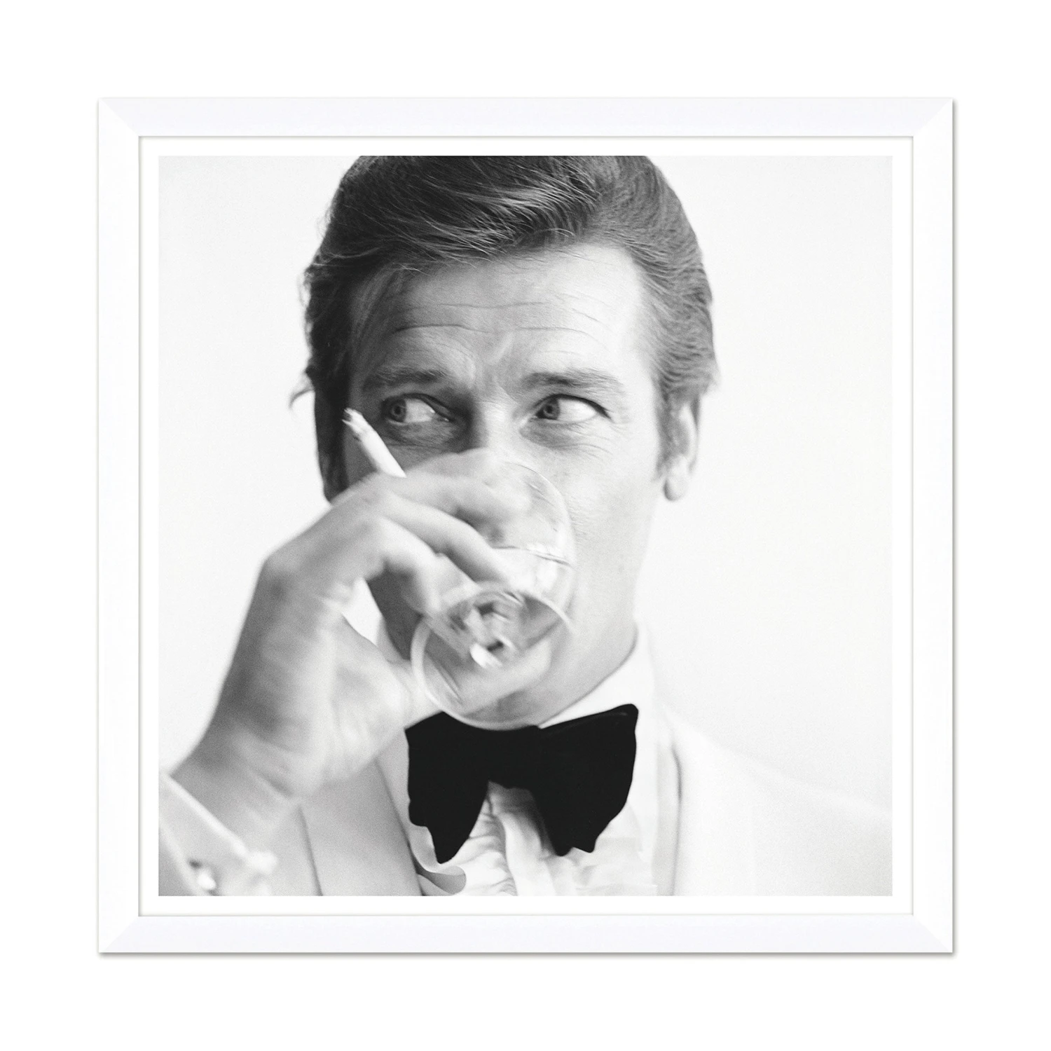Iconic Peter Ruck photography, now available in a smaller size! This piece features Roger Moore, known for his role as the original James Bond, as he enjoys a martini. July 17, 1968.