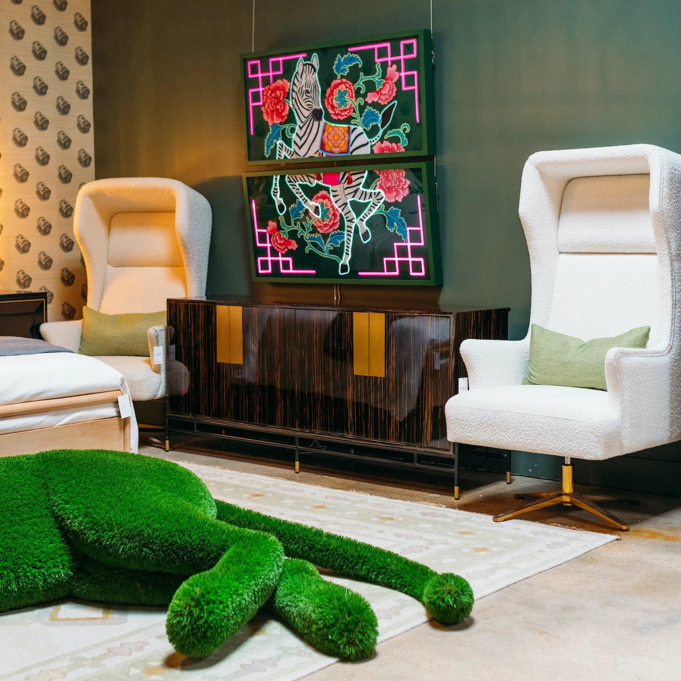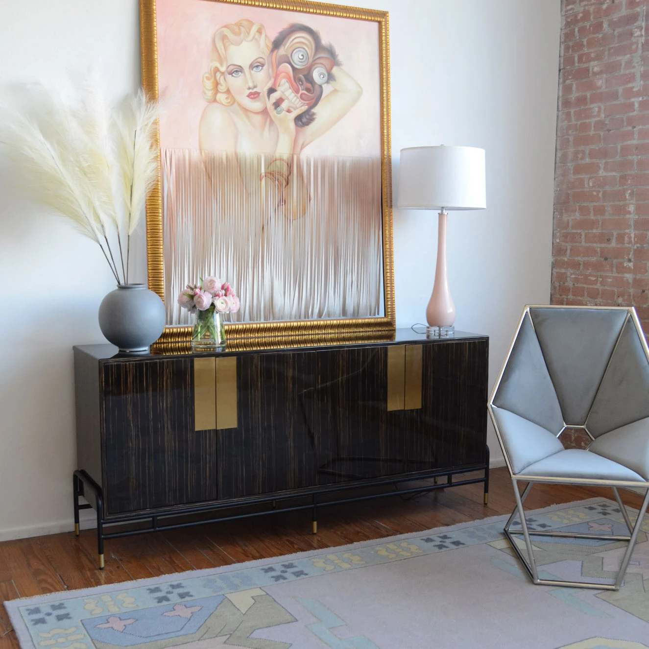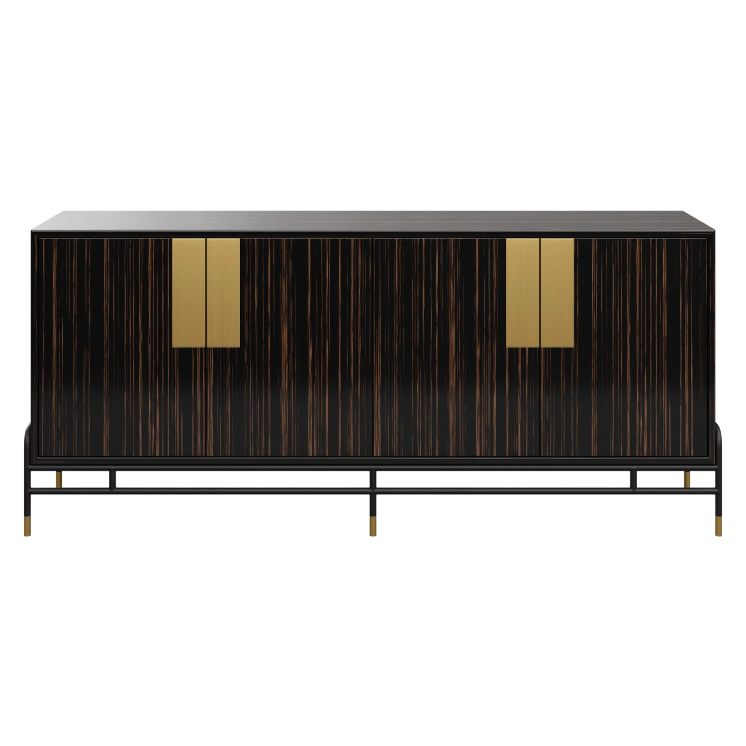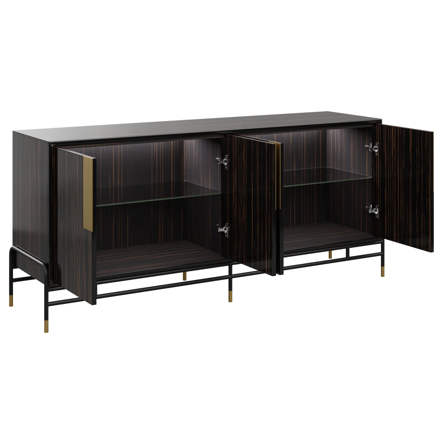 Our Junius Sideboard features gorgeous ebony wood veneer with a high gloss finish. Brass details and slim black legs create sleek contrast. A glass shelf behind both doors provides storage.