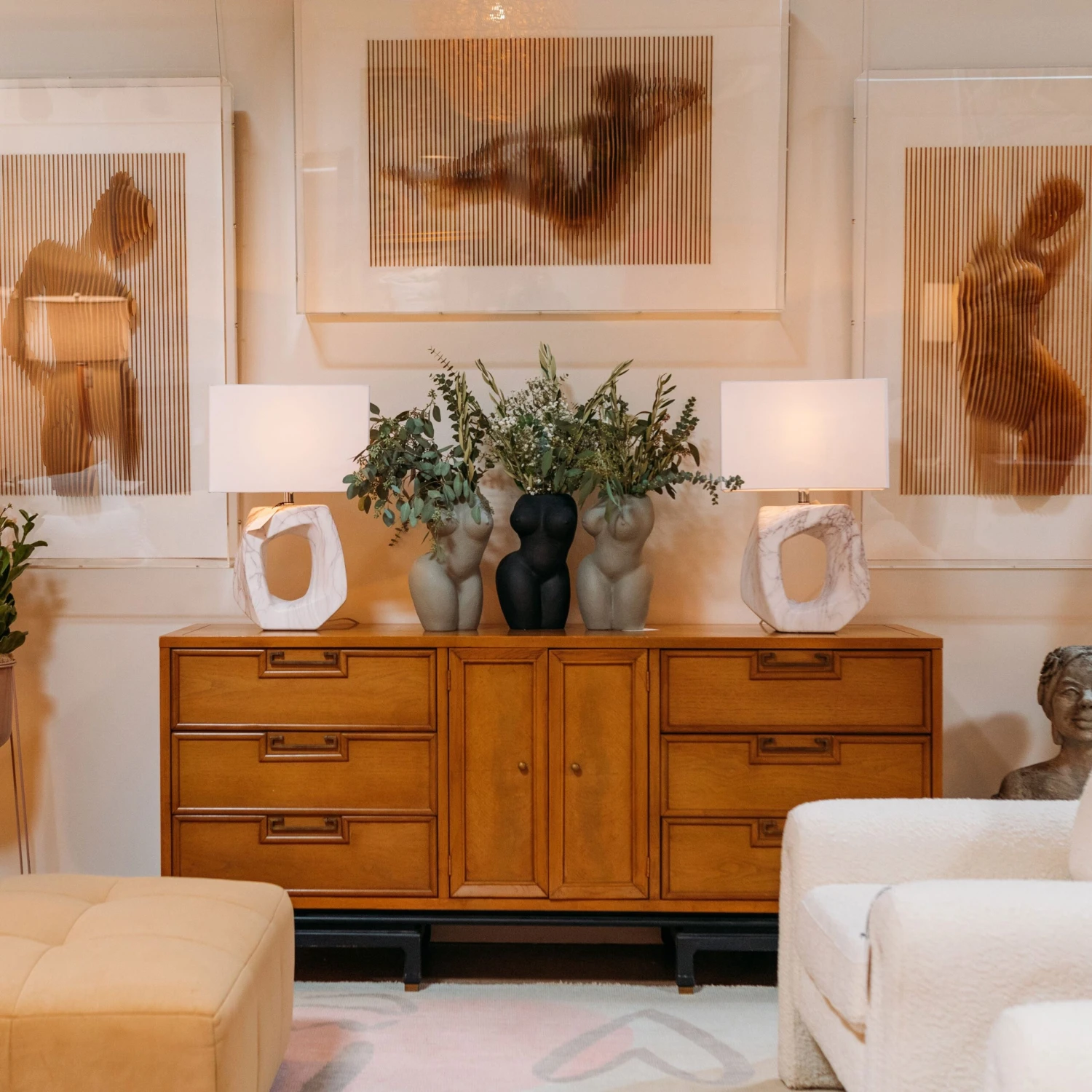 This standing lady pot is a true work of art. Feminine shapes and polyresin combine in this artful plant pot that doubles as a vase.
