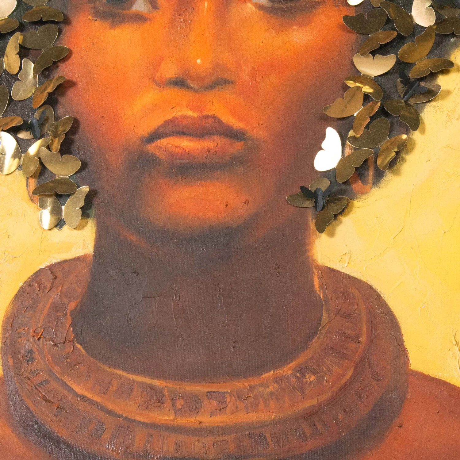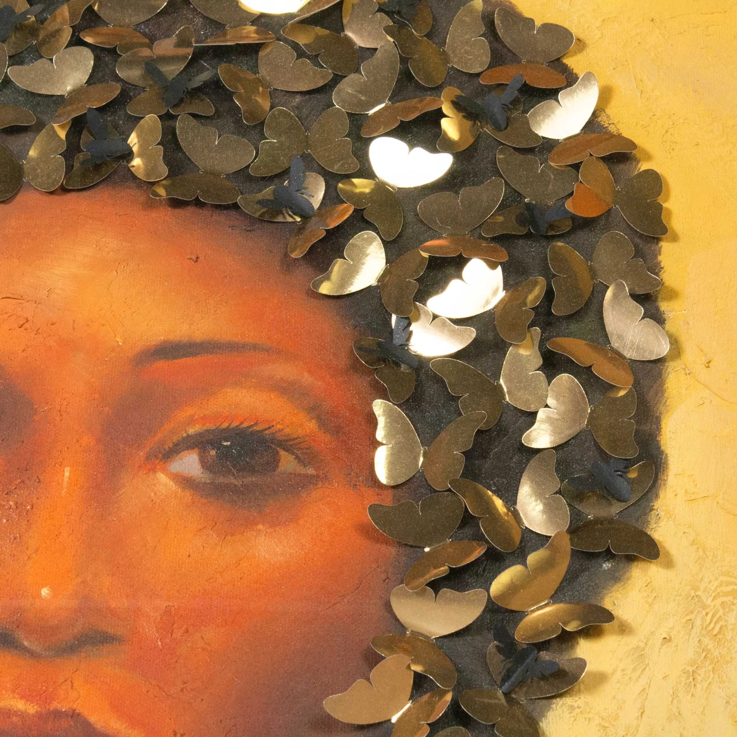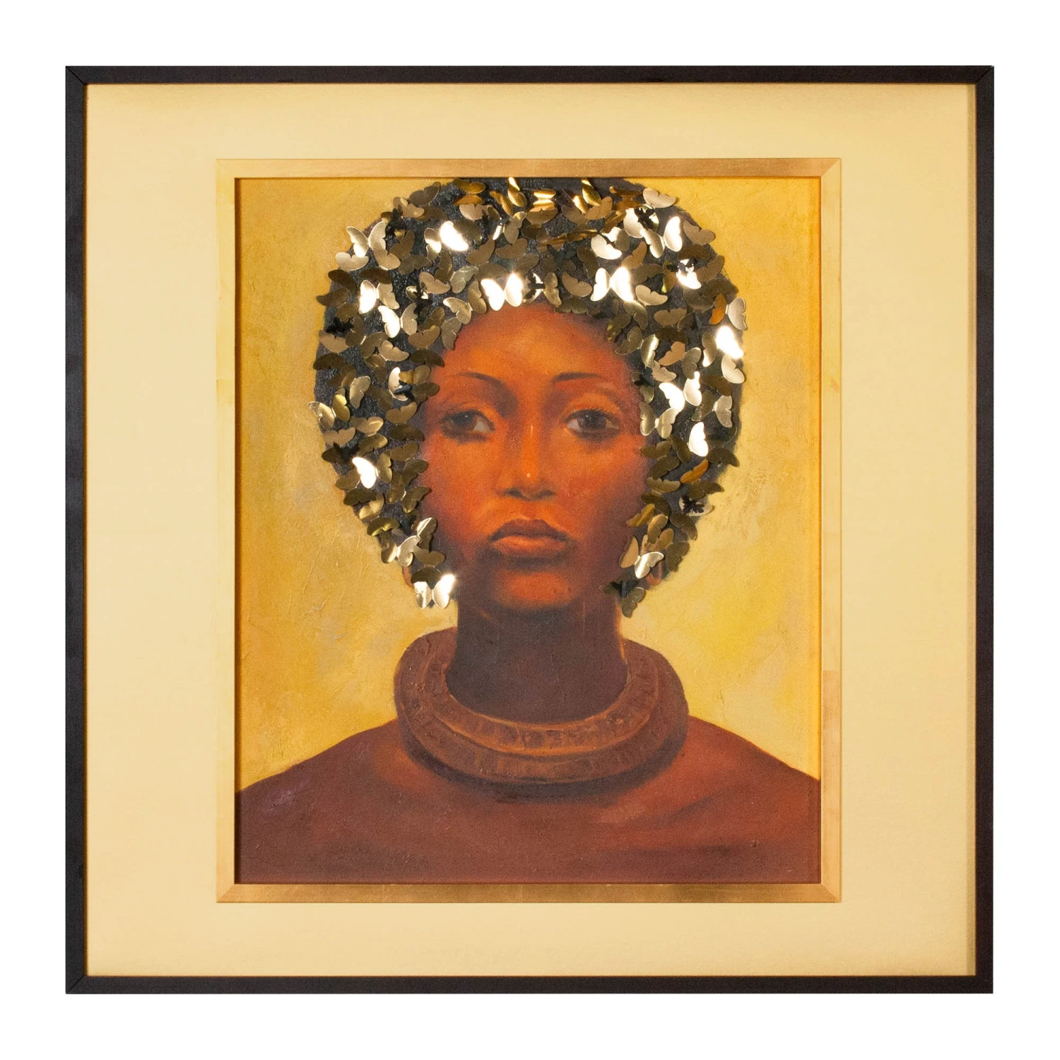 A modern-day blend of chiaroscuro and mixed media, Lady Zola is printed on canvas with a swarm of gold butterflies and bees in her hair.