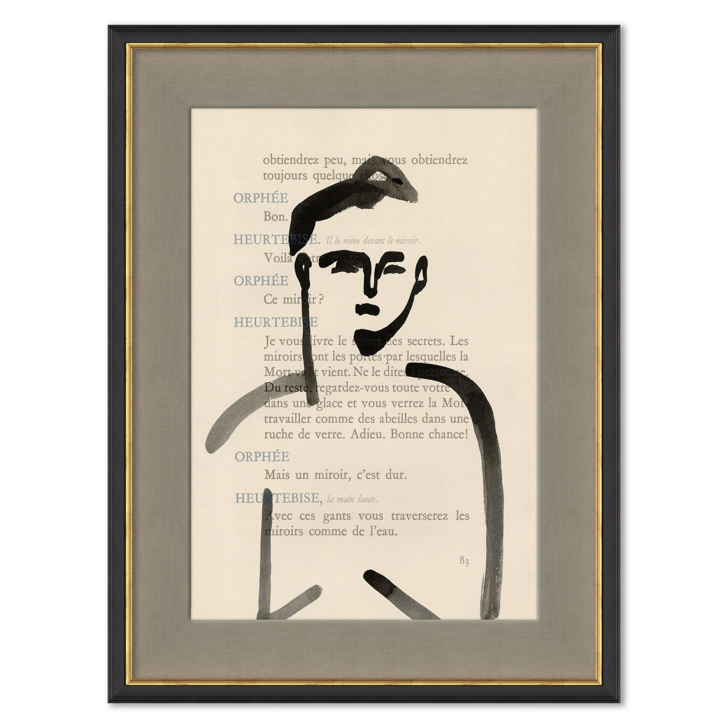 This piece features a portrait by Yuki Osada painted over a page from Jean Cocteau’s play Orphée, known in English as Orpheus.