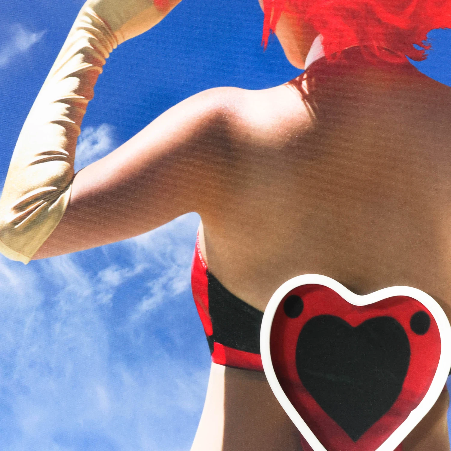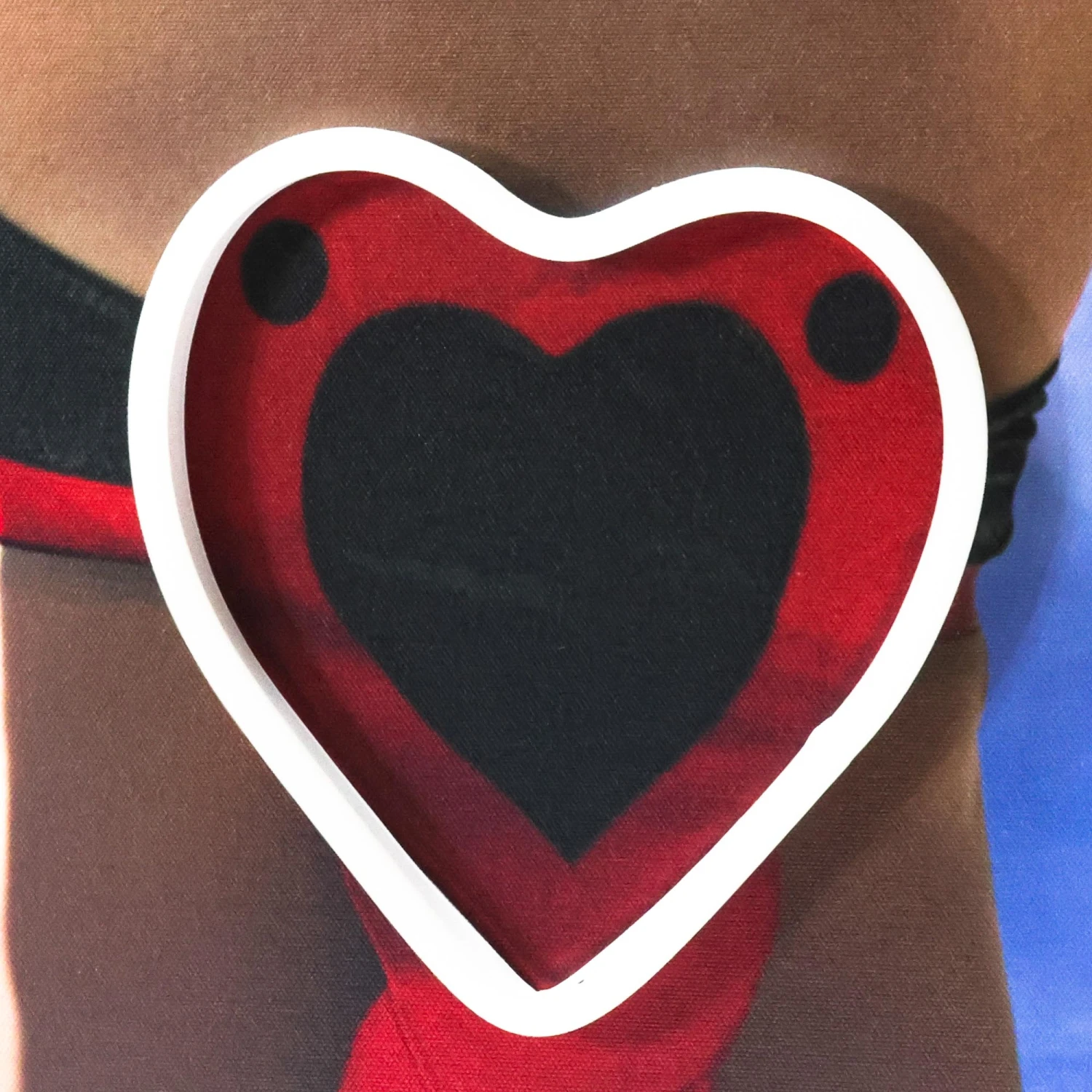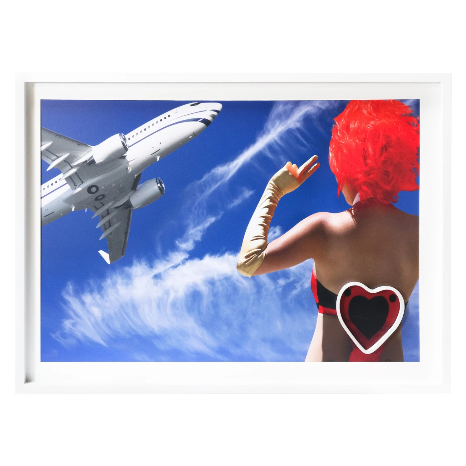 Peace Out features a photography print of a woman holding up a peace sign to a plane in the sky. A light-up neon heart makes this one POP. Framed in white.