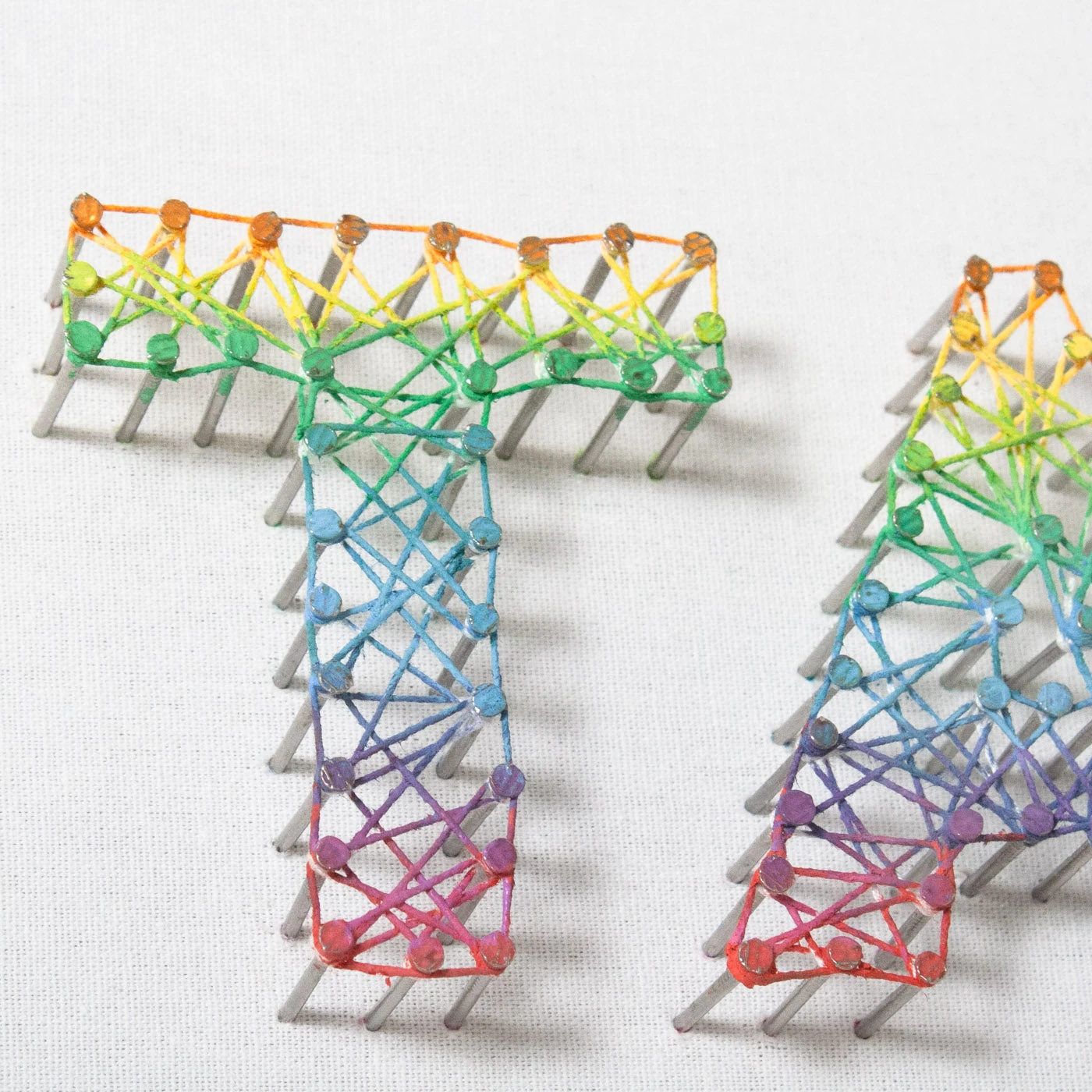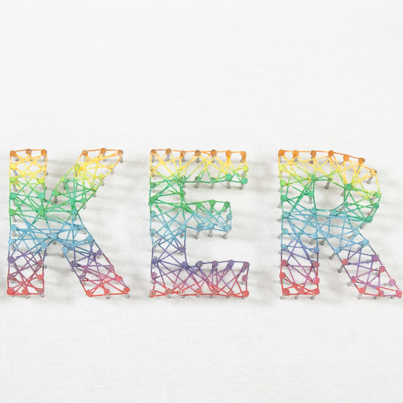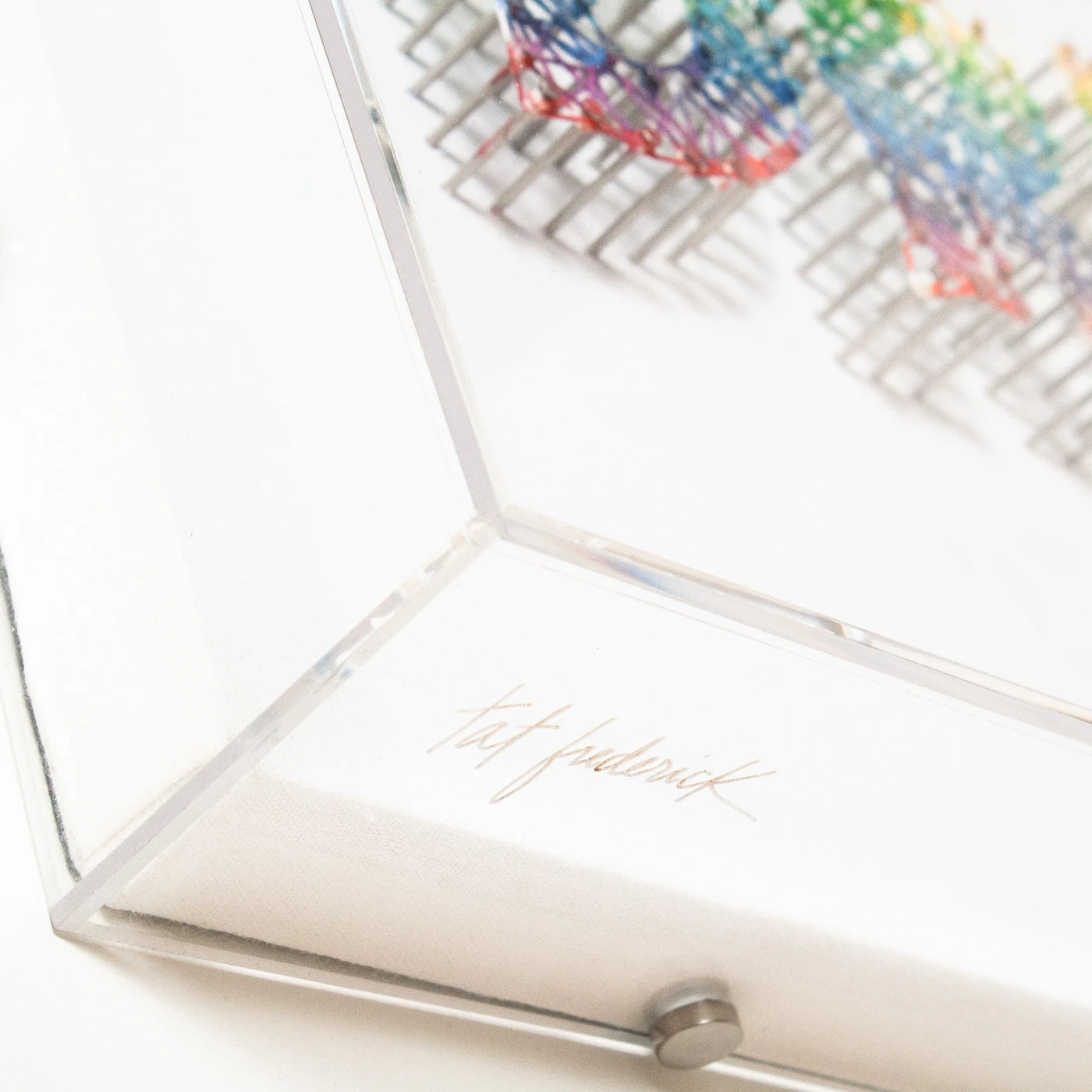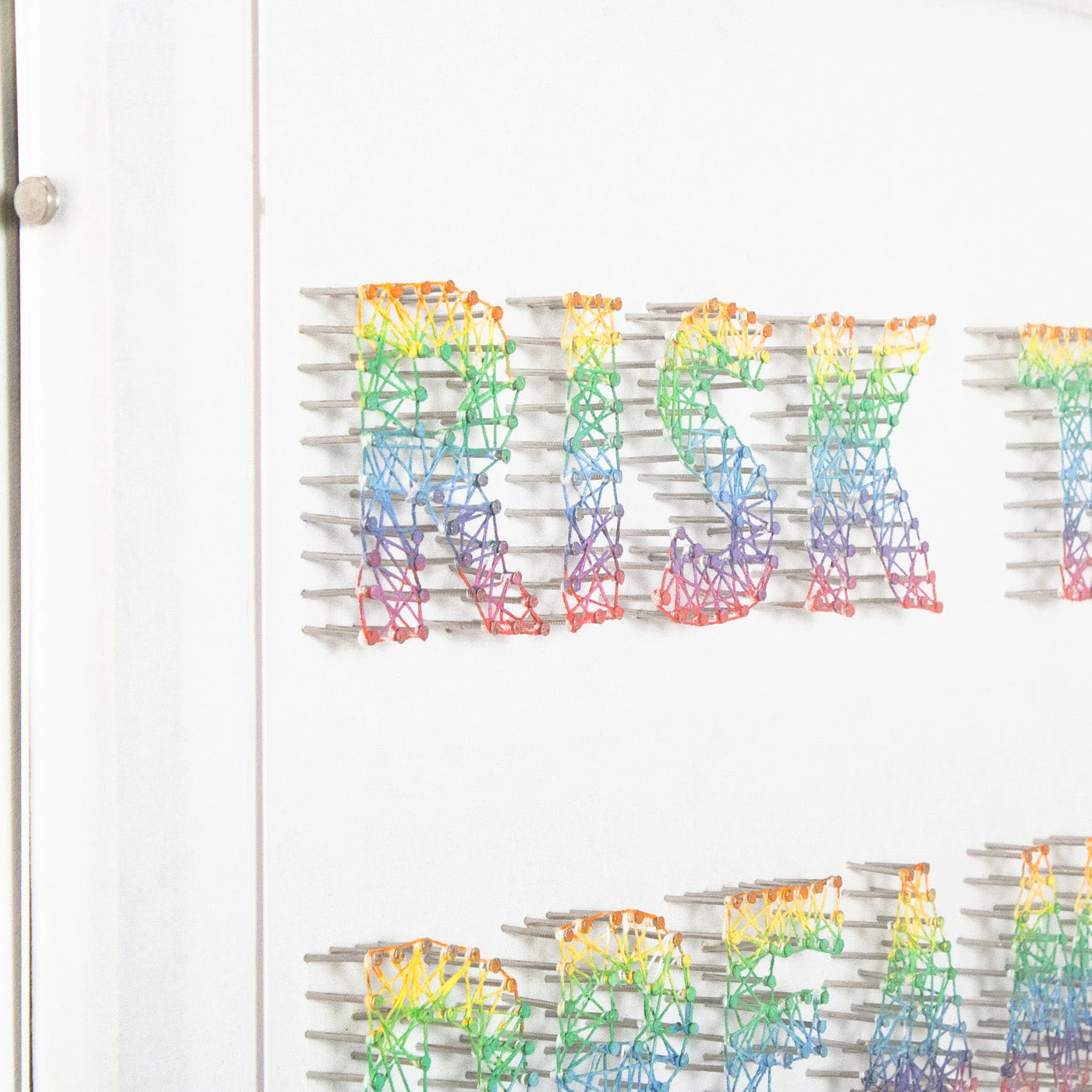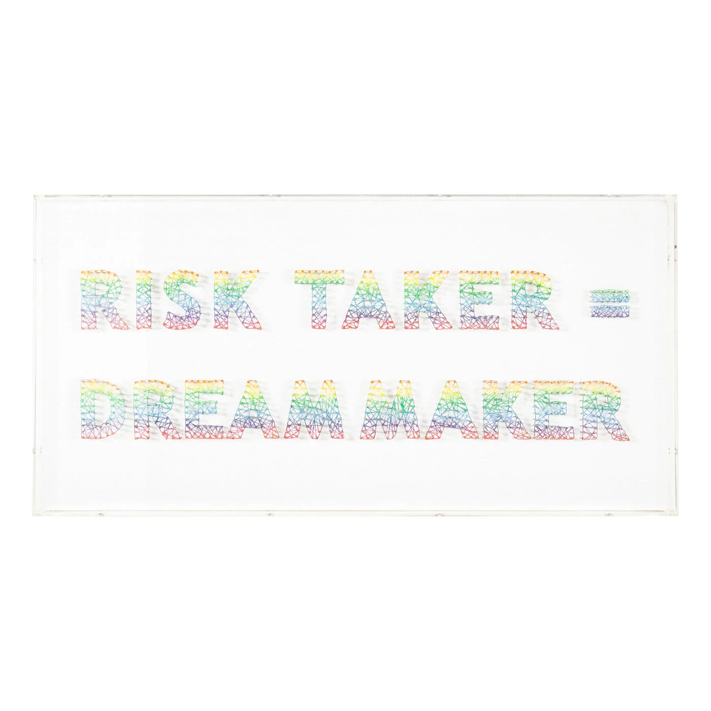 From the Tat Frederick studio, ‘Risk Taker = Dream Maker’ features multi color strings, hand wrapped onto nails. Each nail is hammered into canvas with care and painted along with the string to form a rainbow effect. Framed in an acrylic shadowbox.