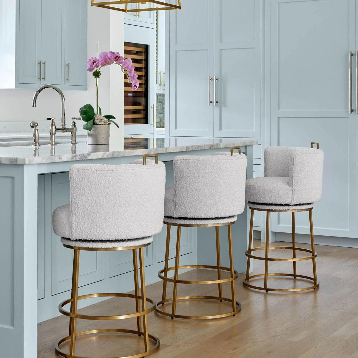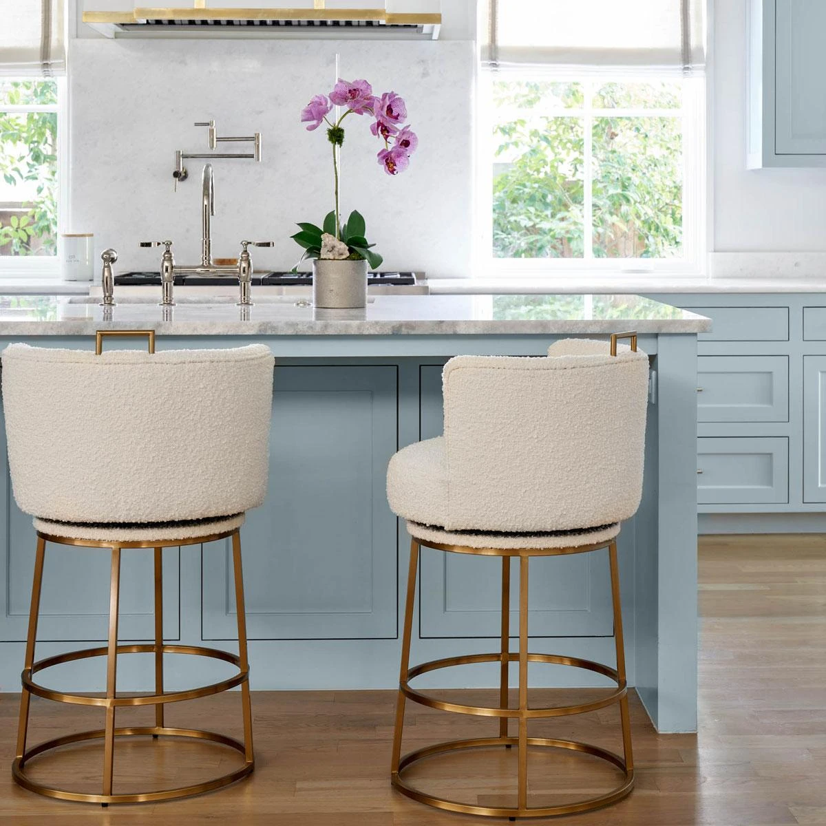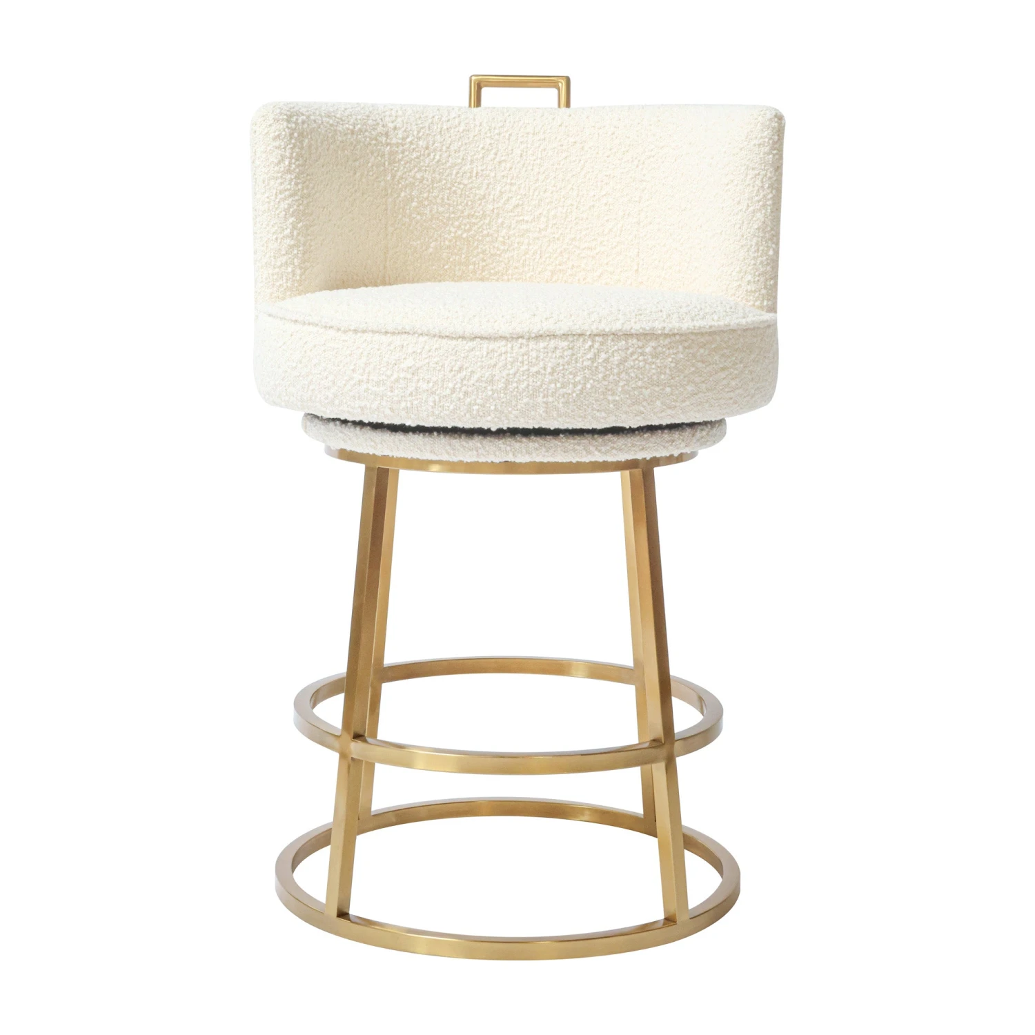 Featuring a brushed antique brass frame and soft ivory boucle fabric. A 360º swivel lets you take in every perspective.