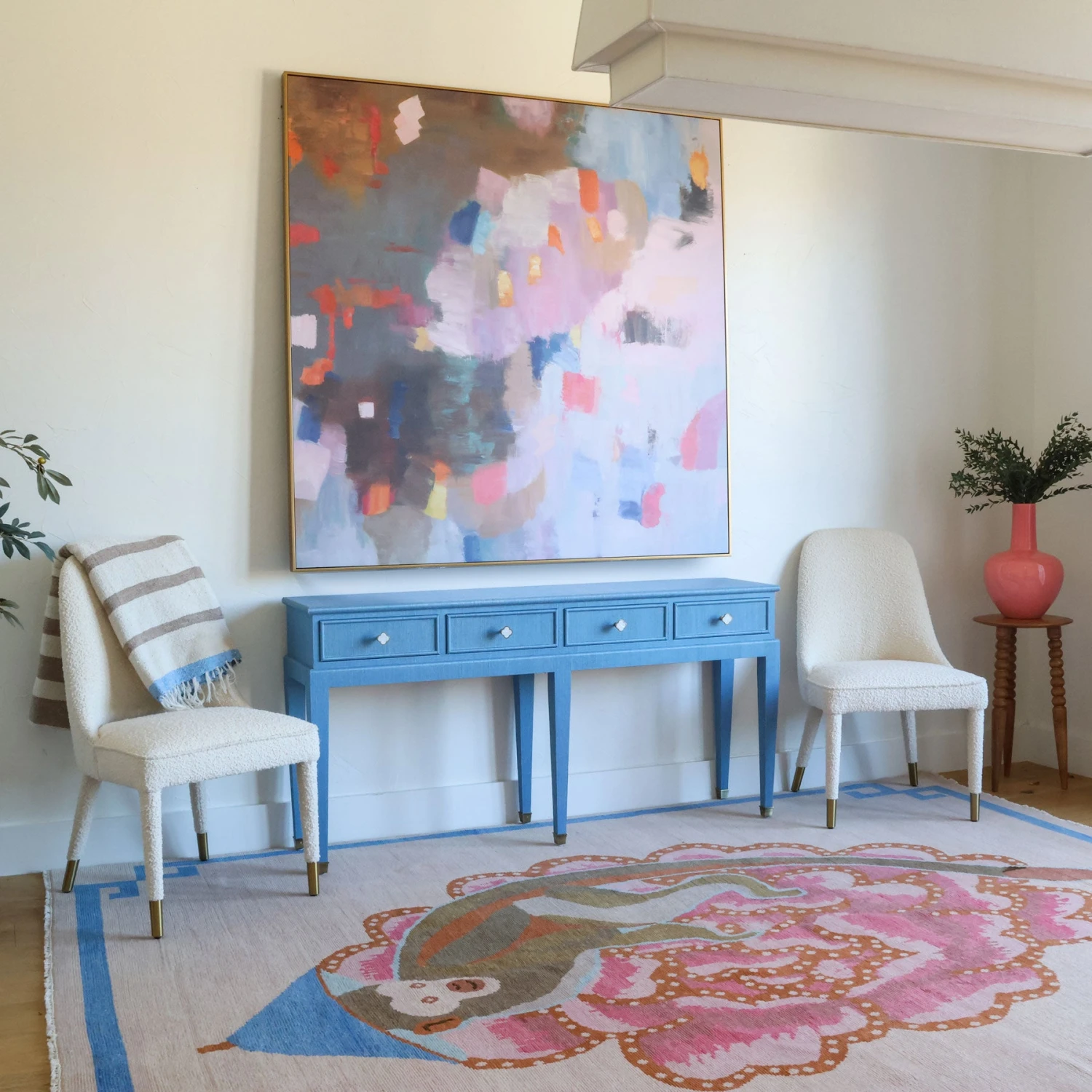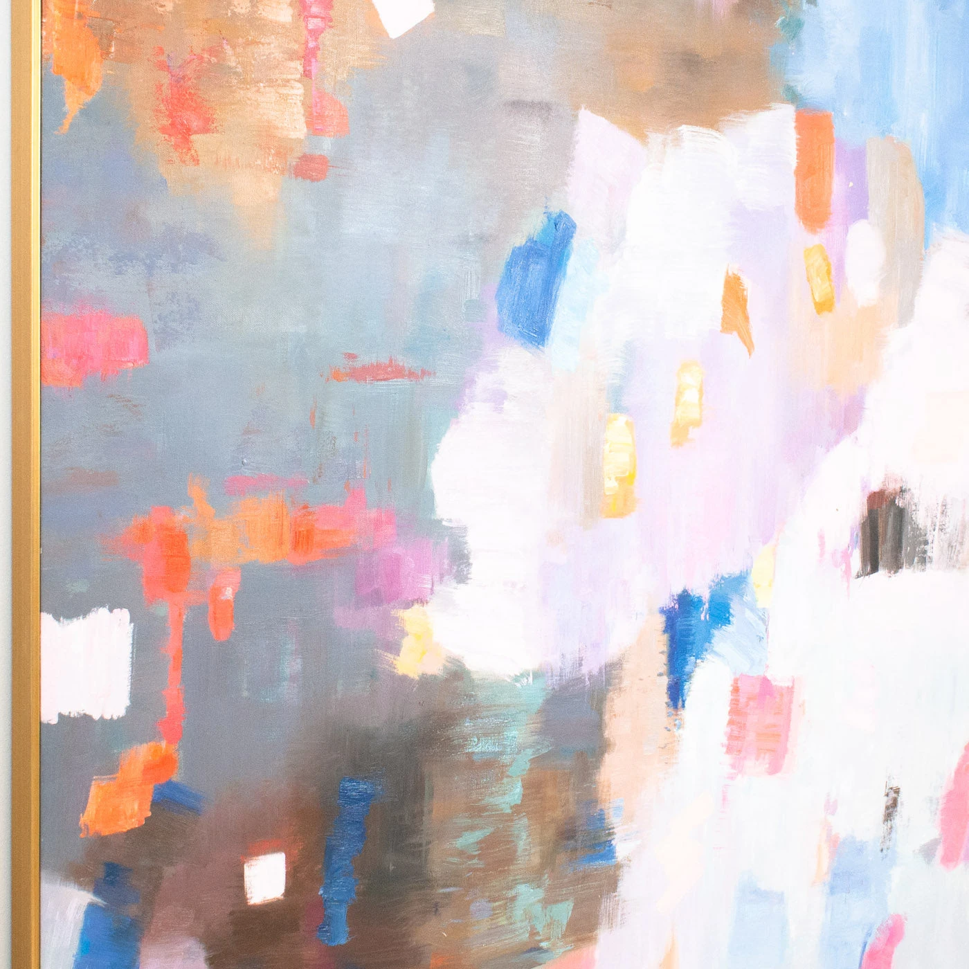 Rowdy yet refined, this piece features abstract hues artfully arranged and giclee printed. Framed in thin gold.