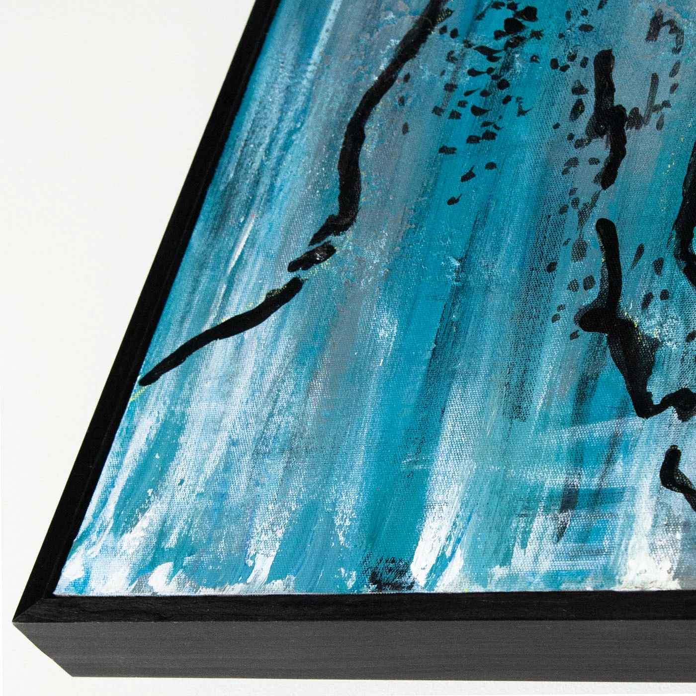 This giclee print by Tat Frederick features a sketch of a woman relaxing in a hammock against a cool-toned abstract background.