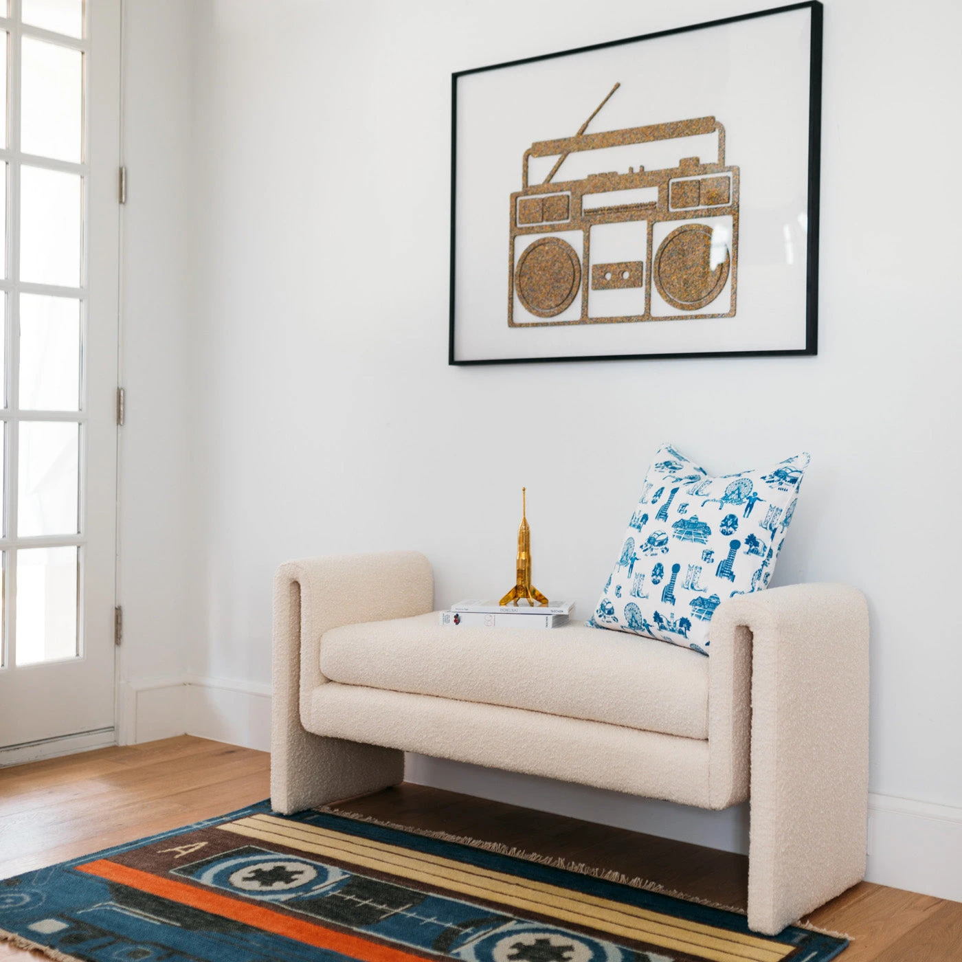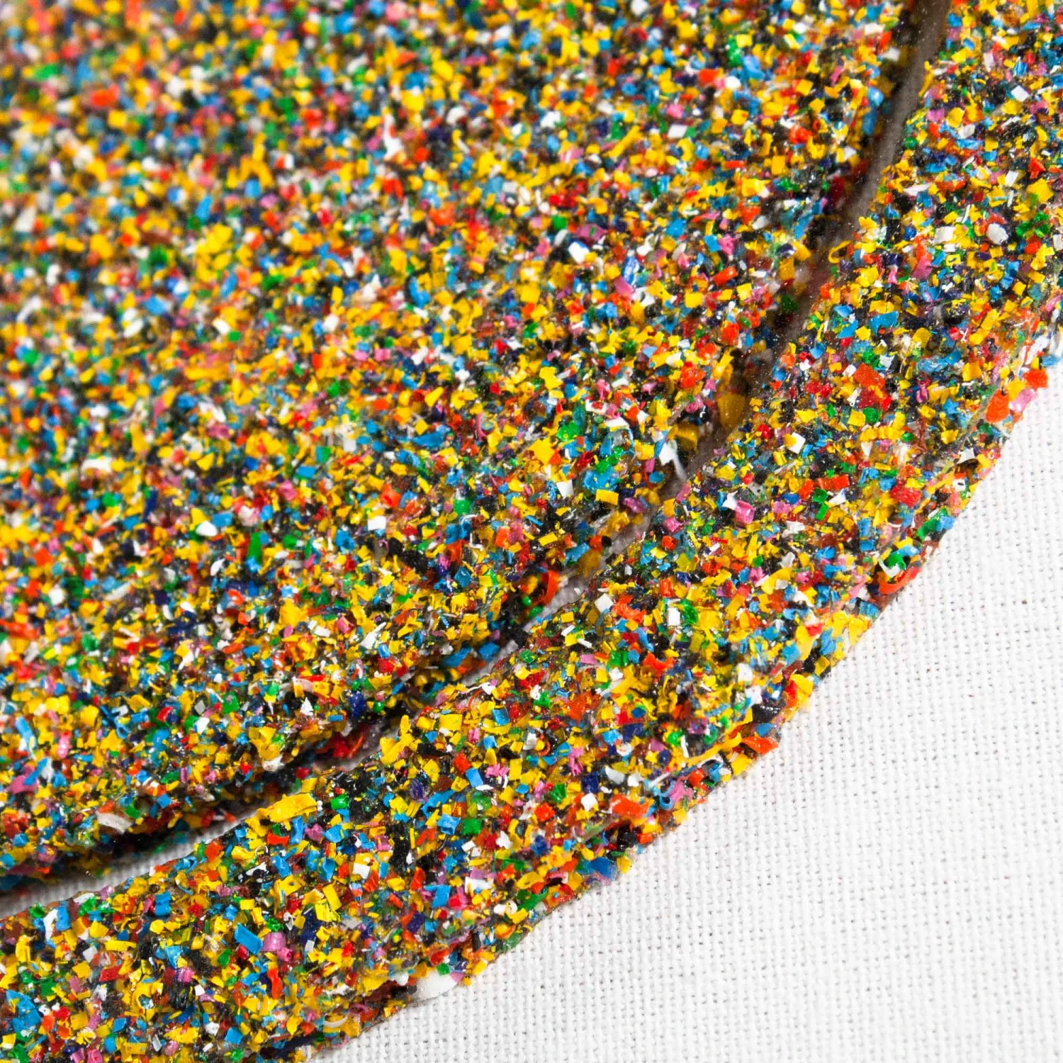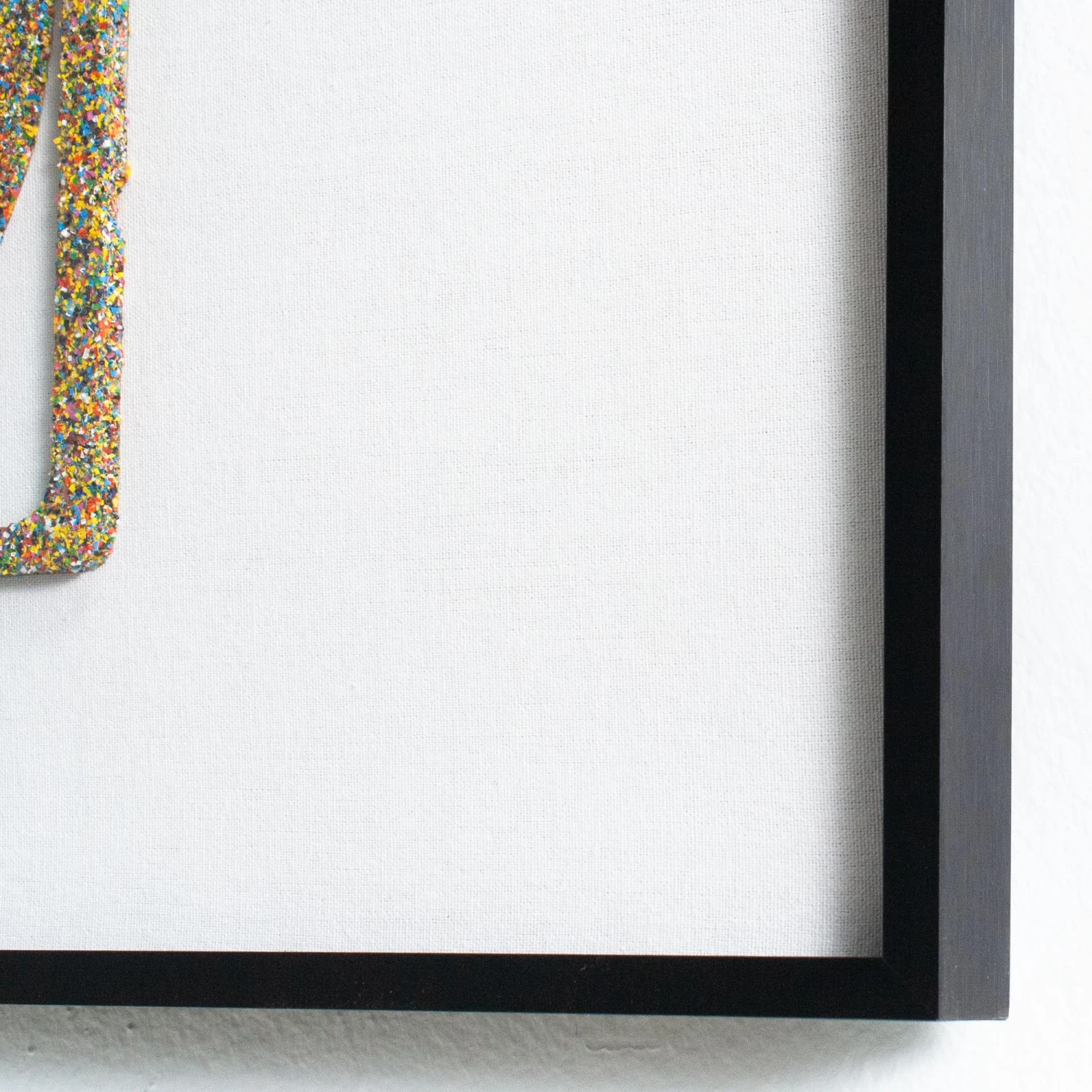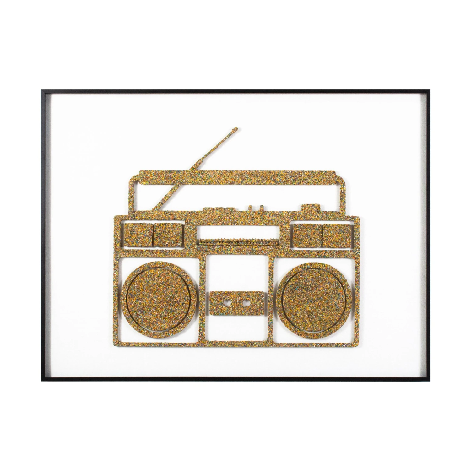 Boombox artwork made of recycled crayons shavings on a white canvas in a black metal frame with a plexiglass panel.