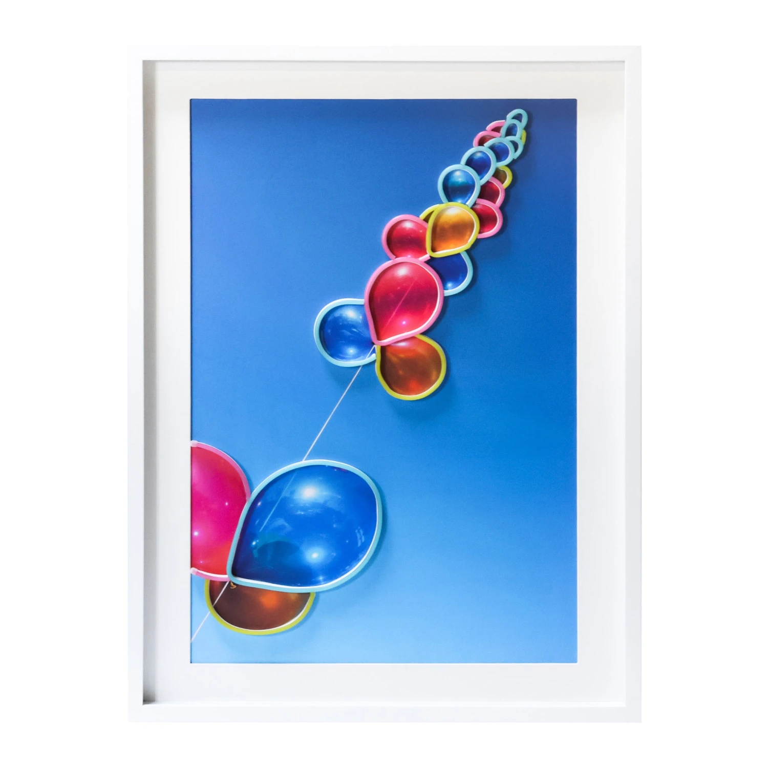 Photography print of multi-colored balloons that are surrounded by multi-hued neon lights. Framed in white.